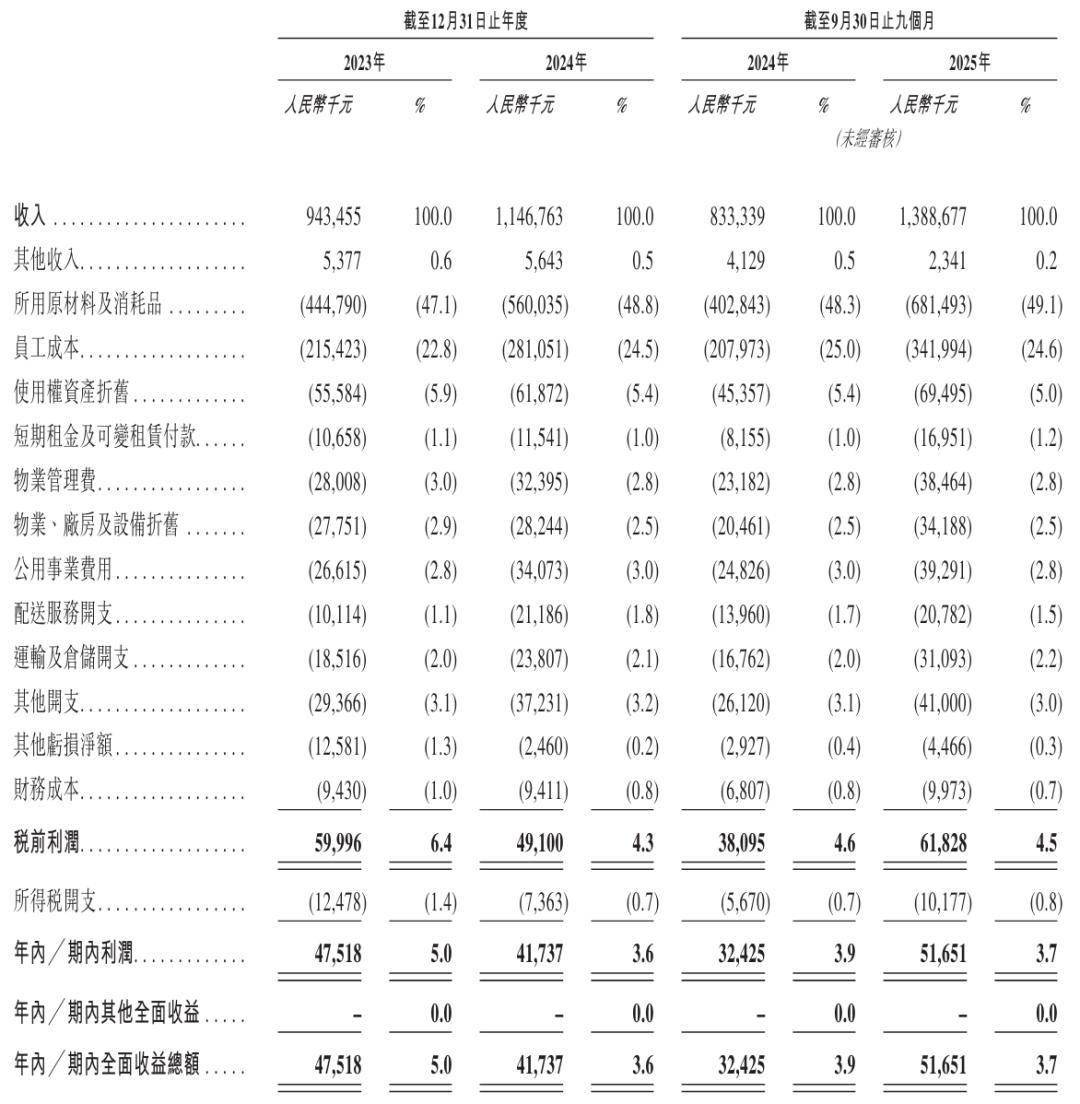 然而,盈利层面却呈现另一番景象。2024年,在营收增长21.5%的情况下,年内利润反而从4750万元下降12.2%至4170万元,年内利润率从5%收缩至3.6%。2025年前三季度,期内利润为5170万元,利润率为3.7%,较上年同期的3.9%微降0.2个百分点。