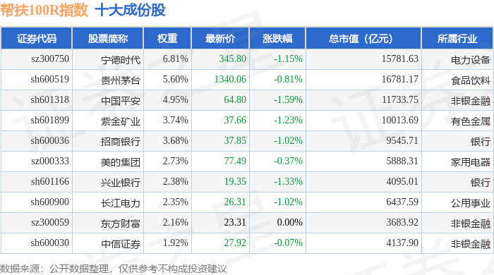 帮扶100R(480065)指数十大成份股详情如下: