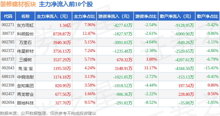 从资金流向上来看,当日装修建材板块主力资金净流入1.41亿元,游资资金净流出8657.9万元,散户资金净流出5471.23万元。装修建材板块个股资金流向见下表: