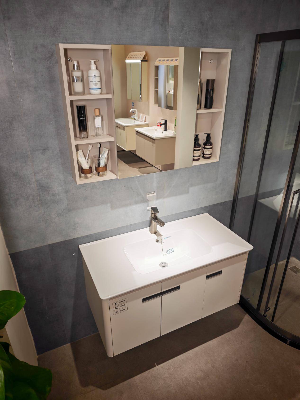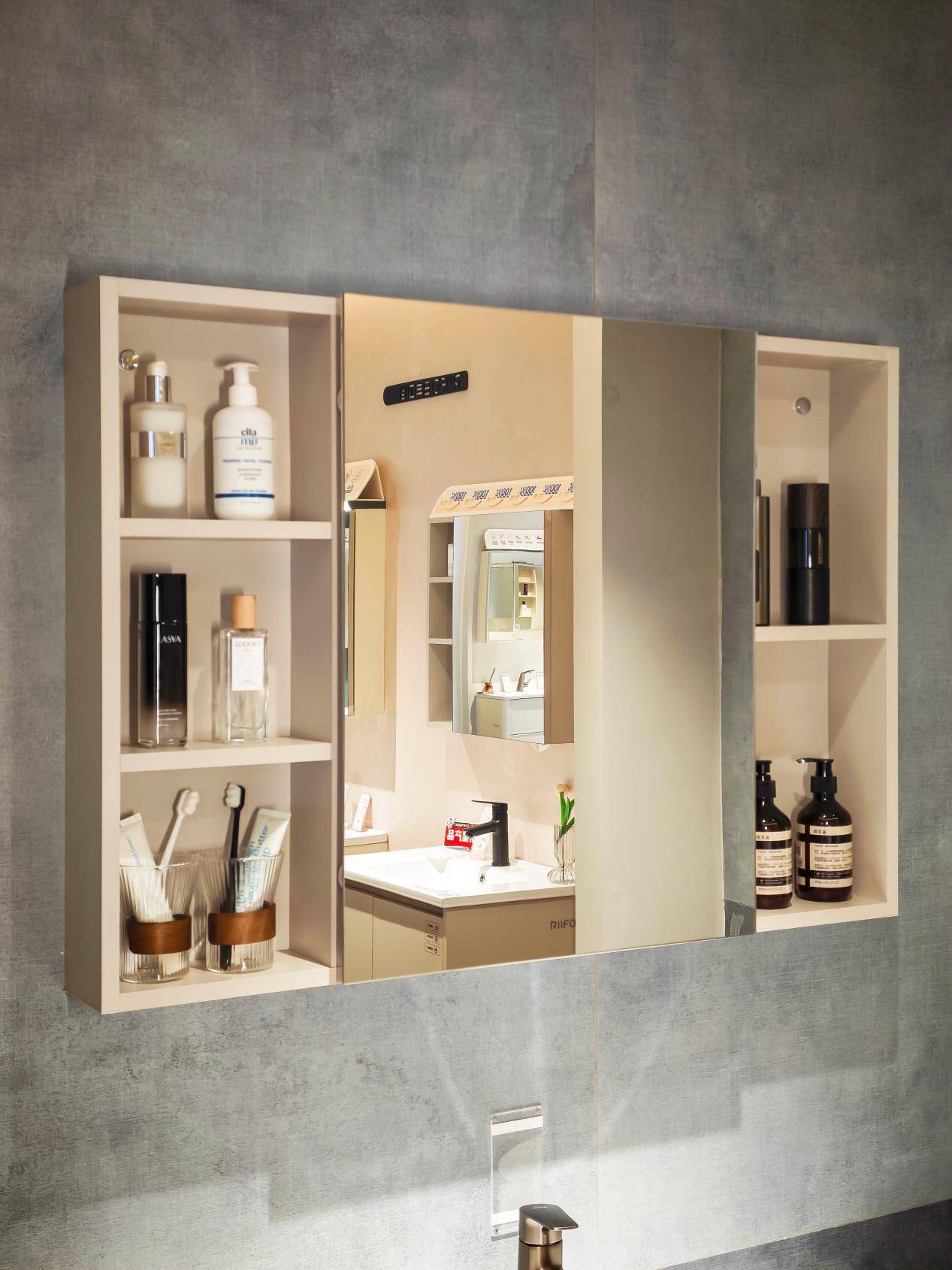 现代浴室柜的收纳核心已从地柜转向镜柜。以日丰卫浴金钢木浴室柜为例,其镜柜内部采用了精密的“美妆镜背收纳系统”。