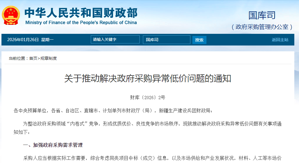 为整治政府采购领域“内卷式”竞争,形成优质优价、良性竞争的市场秩序,财政部日前印发《关于推动解决政府采购异常低价问题的通知》,自2026年2月1日起施行。文件要求: