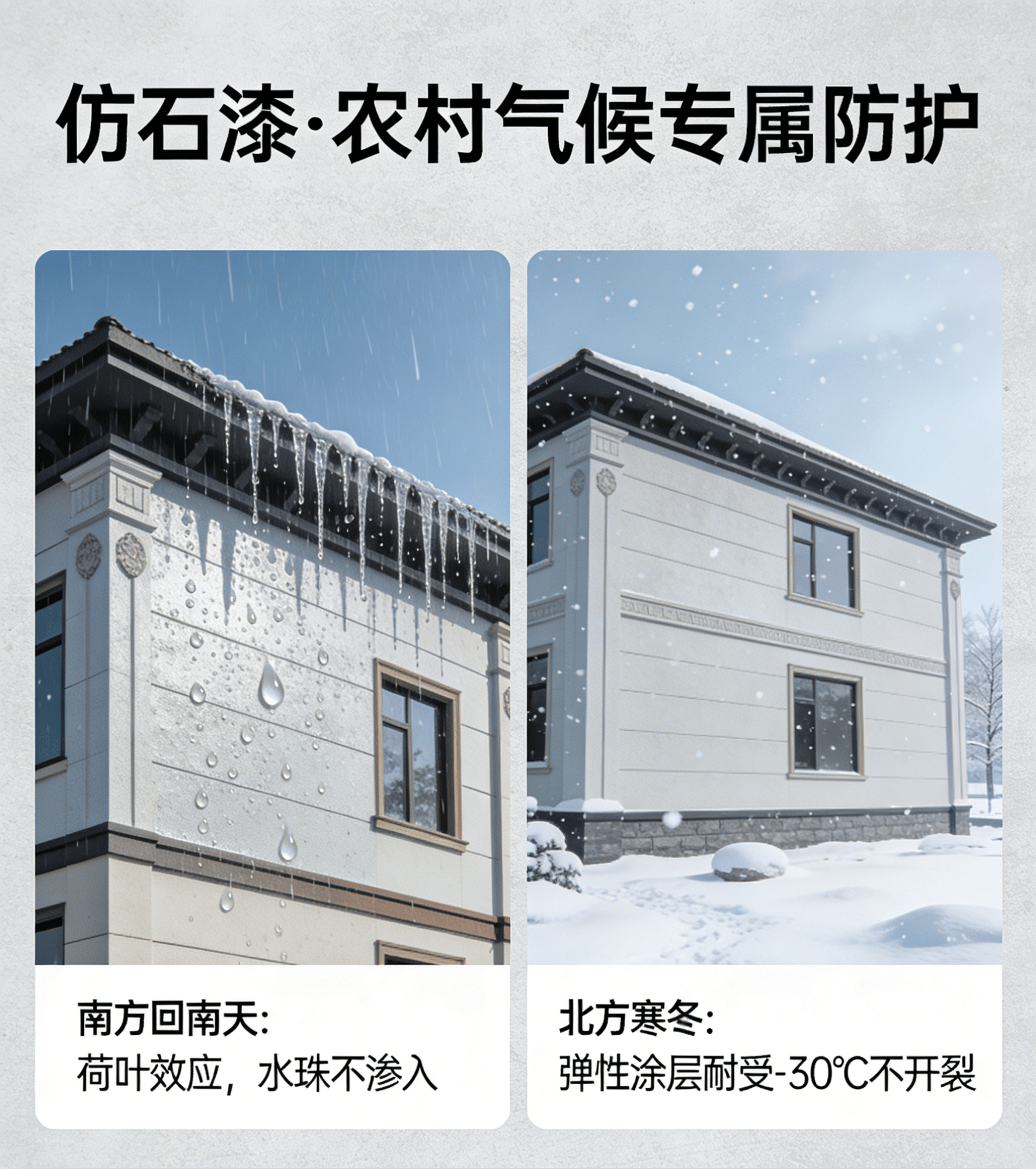 专为农村气候研发。南方回南天,它表面形成“荷叶效应”,水珠滚落不渗入。北方寒冬,它弹性涂层能耐受-30℃考验,不开裂。一次施工,保色保新超过10年,历久弥新。