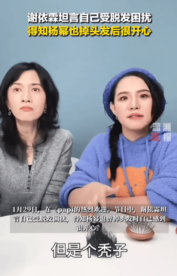 1月29日,在《papi的热烈欢迎》节目中,谢依霖坦言自己受脱发困扰,得知杨幂也曾掉头发时自己感到很开心。因为她觉得对方“终于没那么漂亮了”,但随后杨幂头发又长回来了,让她感叹“这个女人好过分”。