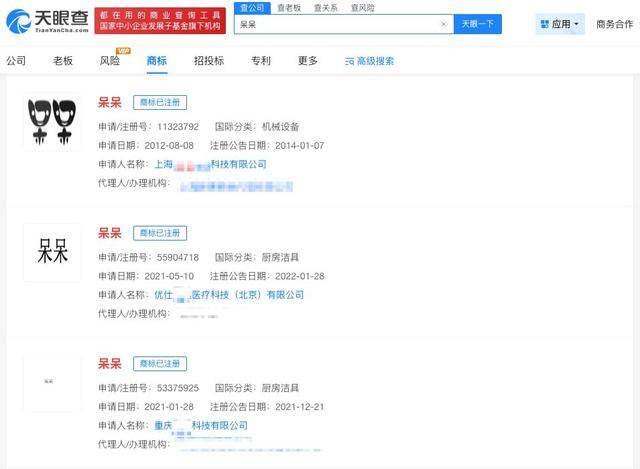 天眼查知识产权信息显示,“呆呆”商标已被申请注册,申请人包括重庆某科技有限公司、泗阳县某网络科技有限公司等,国际分类涉及厨房洁具、日化用品、科学仪器等,当前商标状态多为已注册。