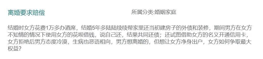 结婚时女方花费1万多办酒席,结婚5年多陆陆续续帮家里还当初建房子欠的外债和装修费。其间男方在女方不知情的情况下使用女方的花呗借钱,说自己还,结果共同还债。男方还试图以女方的名义开通信用卡,女方拒绝后,男方态度冷漠。女方生病,男方也恶语相向。男方想离婚,但想让女方净身出户,女方如何争取最大权益?