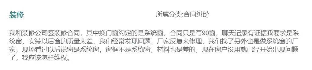 根据你的描述,合同写的是90窗,你聊天时明确提出要系统窗。如果有证据证明对方并未反对,并继续按此谈判、报价、施工,这就可以证明,你们的真实意思表示是做系统窗。并且,系统窗一般单价较高,若报价明显按系统窗报价,也可以同时证明你们约定的是系统窗。窗框存在较为严重的材料偏差,窗户质量明显较差、经常出问题,且需要反复维修,说明装修公司履行合同不符合约定的质量标准,严重影响正常使用和合理期待的使用寿命。