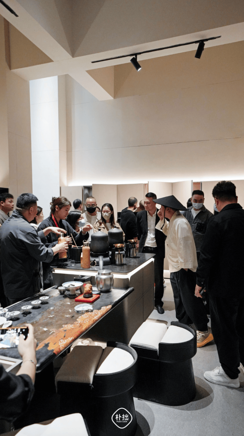 空间核心是一处开阔的茶事区域。茶器在此苏醒,热水注入,茶烟氤氲。人们或坐或立,在 品饮的仪式中,目光随茶叶沉浮,心神借暖意聚拢。器物的功能性与精神性在此融合,茶味不止于口舌,更成为涤荡心尘的媒介。