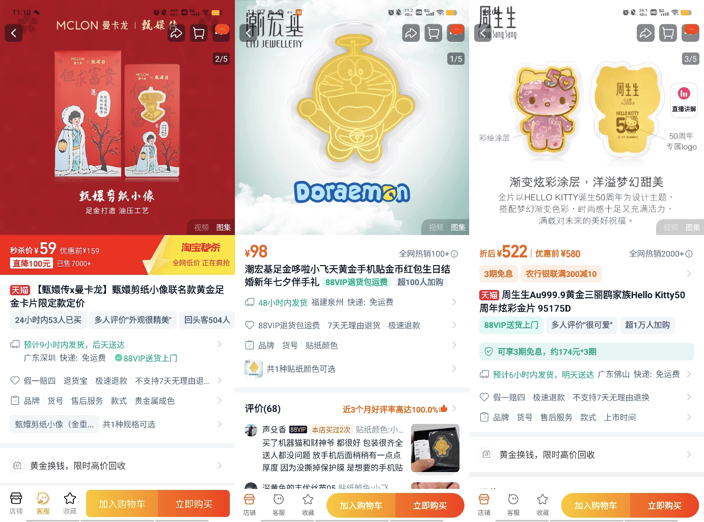 (图说:甄嬛传、哆啦A梦、hellokitty等热门IP也以联名的方式为足金手机贴的款式设计提供了新灵感)