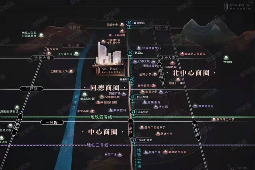 屹立北京路金刀营,昆明城市中轴线上;紧邻地铁2号线金星站、北辰站 邻近同德广场、北辰财富中心;与明通小学、金实小学为邻;优享市一人民医院、云南省中西医结合医院;近揽盘龙江、月牙潭、龟龙湖生态美景