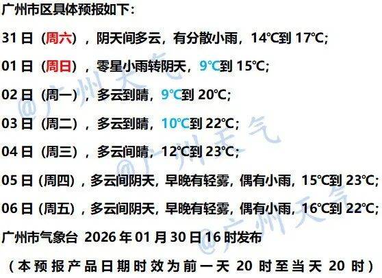 据广州天气预测,本轮降温最低气温9℃出现在2月1日和2月2日的早晨。