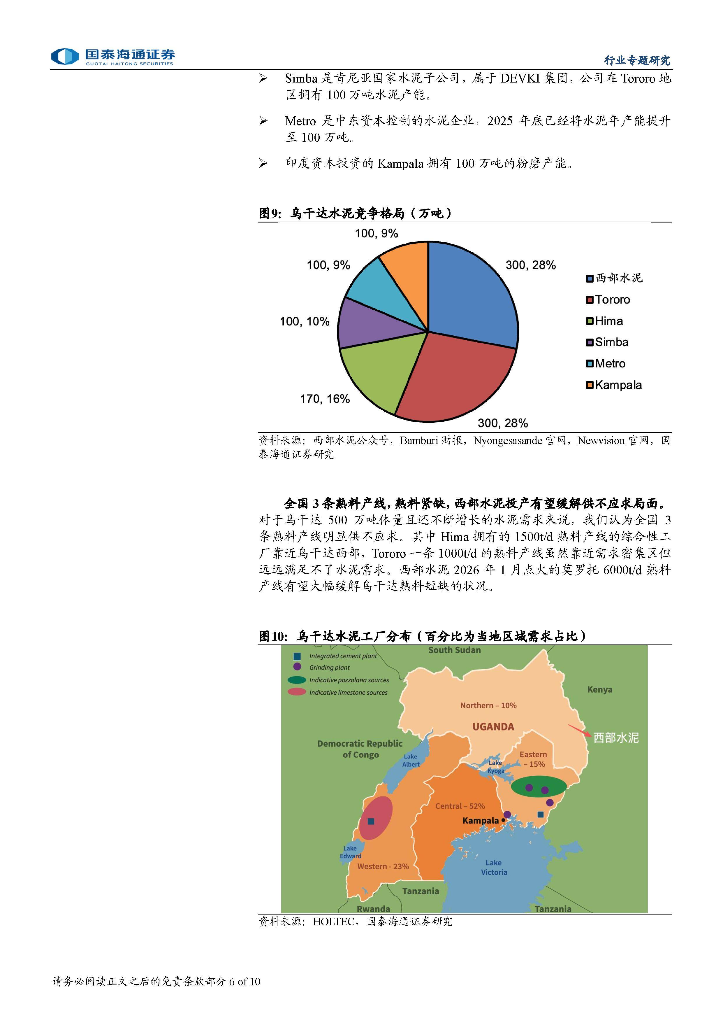 西部水泥于2026年1月成功点火莫罗托6000吨/日熟料线,成为破局关键。该项目依托乌干达东北部唯一石灰石矿山,具备资源稀缺性,不仅将大幅缓解国内熟料短缺,还可辐射南苏丹、刚果(金)东部及肯尼亚西部市场。凭借完整的产业链、低成本原料保障和规模优势,西部水泥有望打破现有高成本结构,实现显著盈利改善。当前市场由西部水泥、Tororo与Hima三家企业主导,合计市占率达72%,竞争格局清晰且良性。