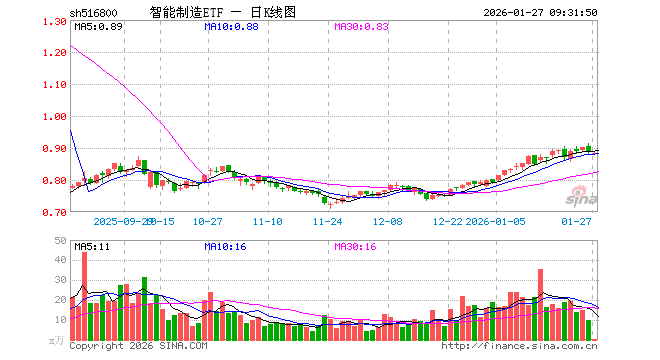 1月27日,智能制造ETF(516800)开盘跌0.45%,报0.883元。智能制造ETF(516800)重仓股方面,中芯国际开盘涨0.07%,北方华创跌0.44%,工业富联涨0.42%,寒武纪涨0.00%,京东方A涨0.00%,兆易创新跌0.89%,汇川技术跌0.25%,中科曙光涨0.02%,海康威视跌0.34%,国电南瑞跌0.39%。