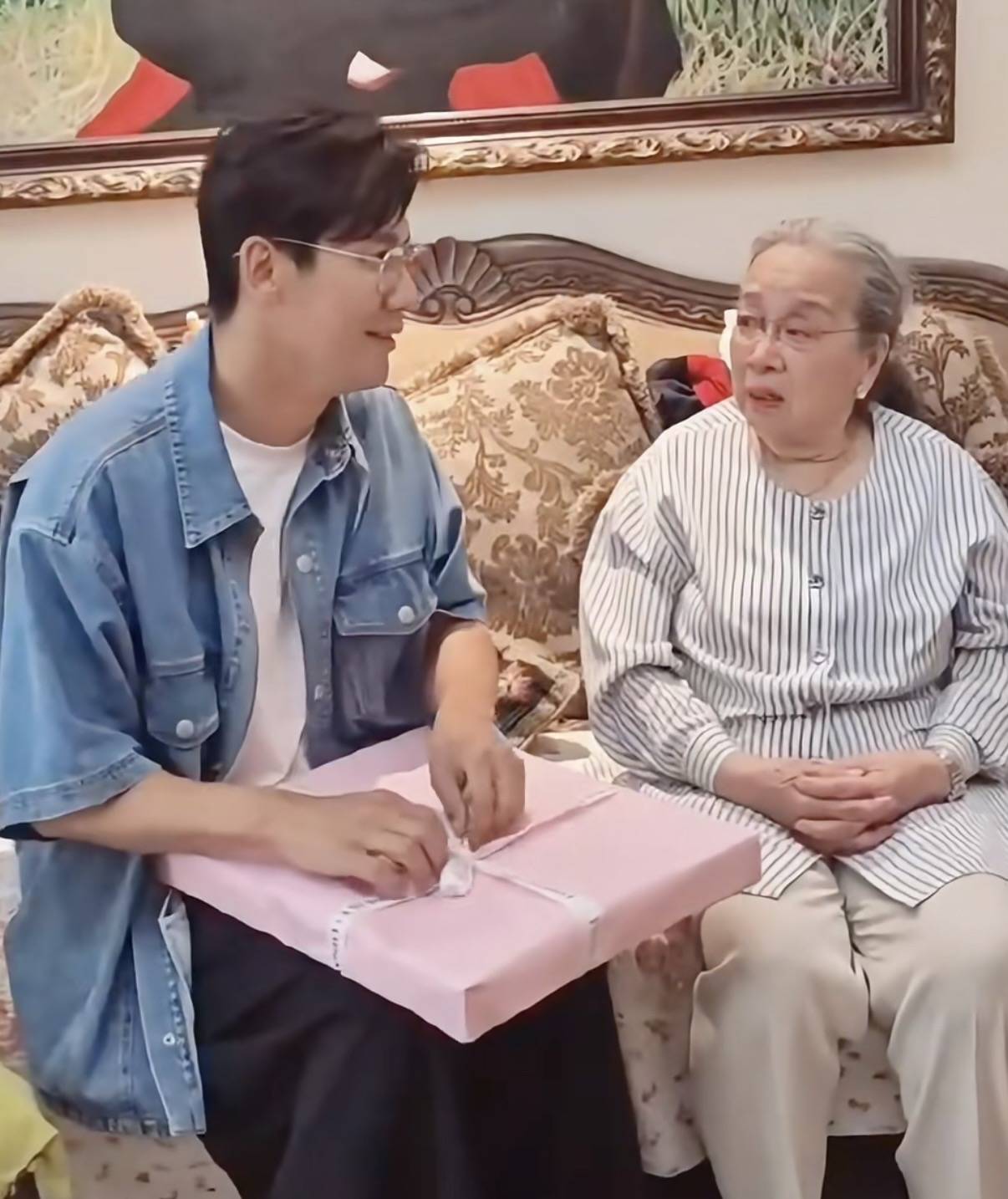 端午节的时候,也有年轻演员拜访李明启。那时候她穿着条纹上衣、米白色的裤子,模样温柔慈祥。