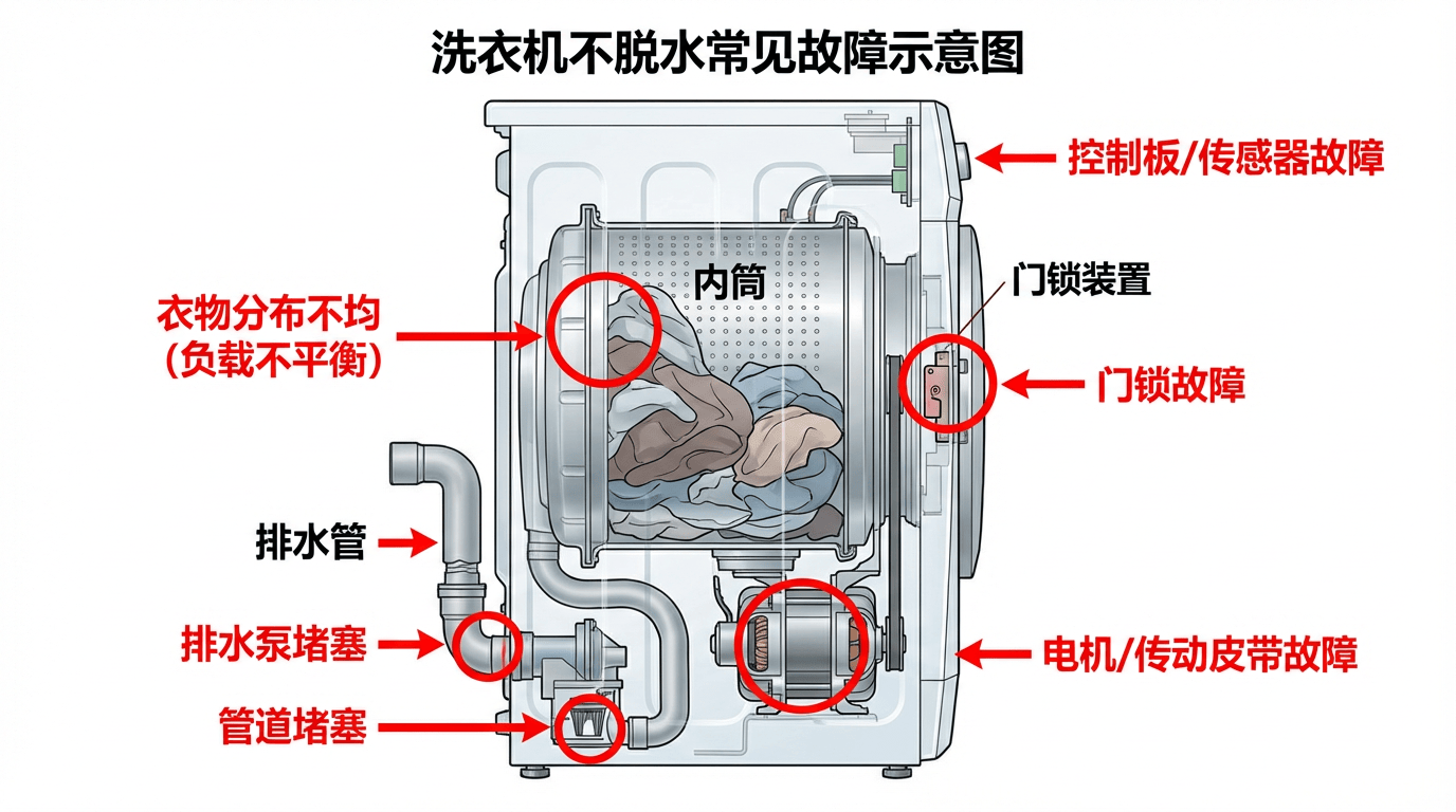 是否遇到过这样的情况:在洗涤程序结束之后,把洗衣机盖子打开一看,衣物依然是湿漉漉的,脱水功能不进行工作。这个问题往往会让人比较头疼,尤其是在阴雨天气当中,湿衣物不容易晾干更会带来麻烦。可以不必过于担心,下面就对洗衣机不脱水的常见缘由以及对应的处理办法进行一个较为系统的梳理。