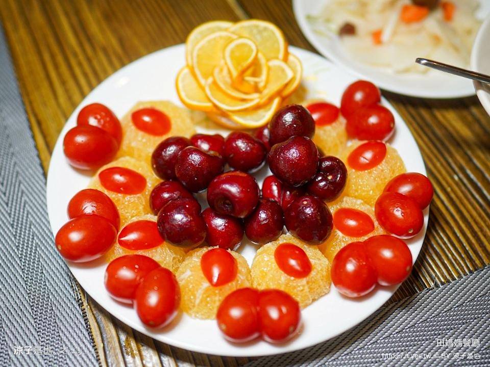 ▼季节水果,水果摆盘太用心了吧!还出现好多爱心,金古椎~橙子、樱桃、蕃茄都有新鲜,厚呷!