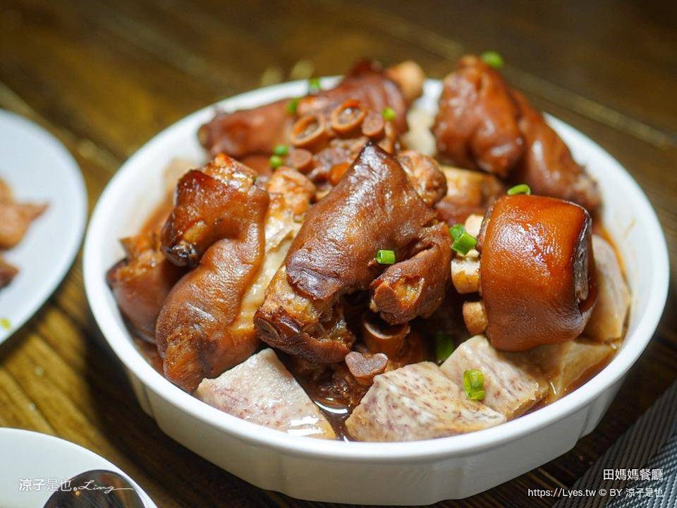 ▼芋香红烧猪脚,猪脚卤得软嫩入味,吃到得满满肥嫩胶质且不腻口;芋头吸饱卤汁后松绵绵密,带出芋头自然甜味。