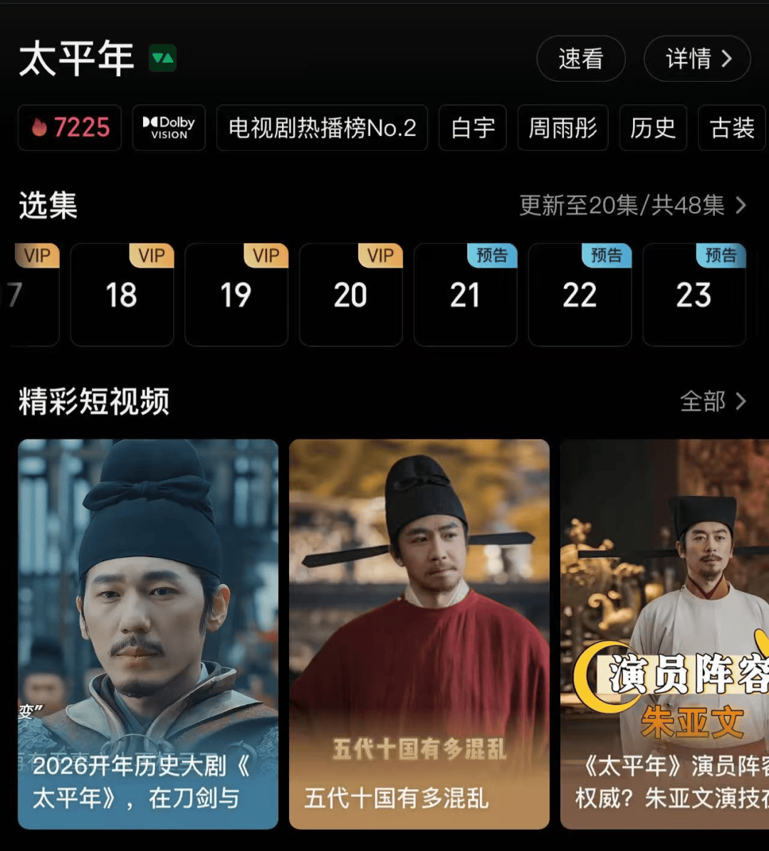 据此前报道,1月31日,央视历史剧《太平年》因周末节目编排调整暂停更新,引发剧迷广泛讨论。该剧以罕见的五代十国为背景,聚焦吴越国“纳土归宋”事件,讲述吴越王钱弘俶与宋太祖赵匡胤,携手实现山河统一的历史故事。随后,“太平年停更”“太平年改档”等话题词冲上微博热搜。截至1月31日晚上,该剧在网络平台已更新至第20集。