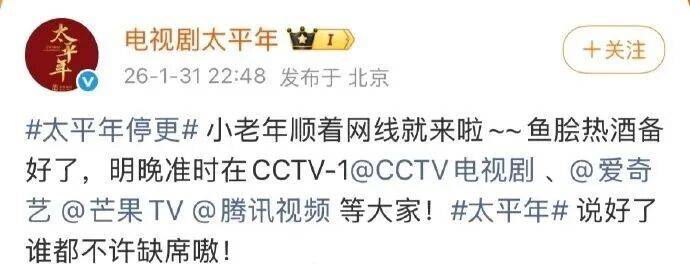“太平年停更”上热搜当晚, @电视剧太平年 曾发博回应:小老年顺着网线就来啦~~鱼脍热酒备好了,2月1日晚准时在CCTV-1@CCTV电视剧、@爱奇艺@芒果TV @腾讯视频 等着大家,说好了都不许缺席嗷。