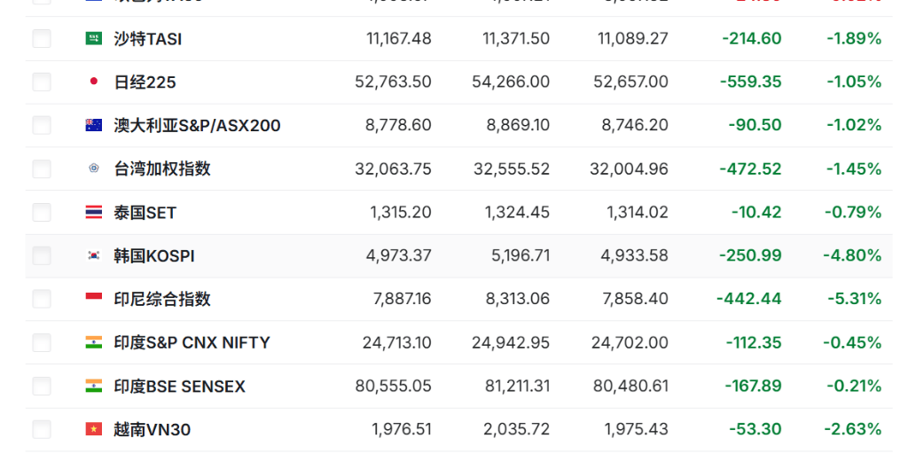 科技股在AI投资前景不确定性加剧的背景下遭遇重创。MSCI亚洲科技指数创下自11月以来最大跌幅,韩国Kospi指数作为AI板块风向标暴跌4%,纳斯达克100指数期货下跌超过1%。