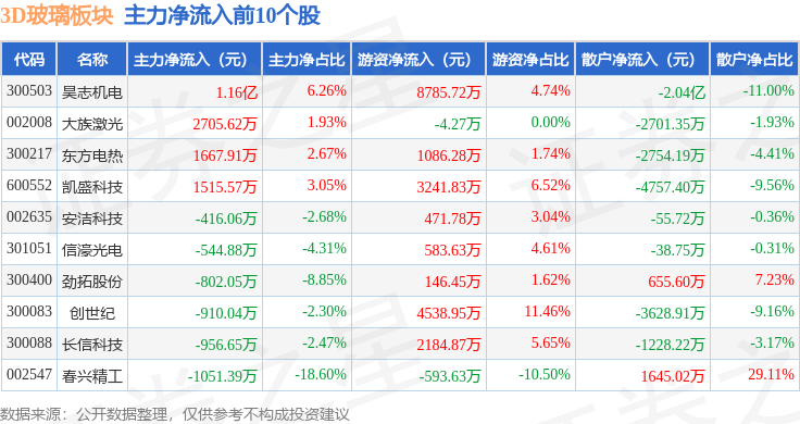 从资金流向上来看,当日3D玻璃板块主力资金净流出18.01亿元,游资资金净流入7.71亿元,散户资金净流入10.31亿元。3D玻璃板块个股资金流向见下表: