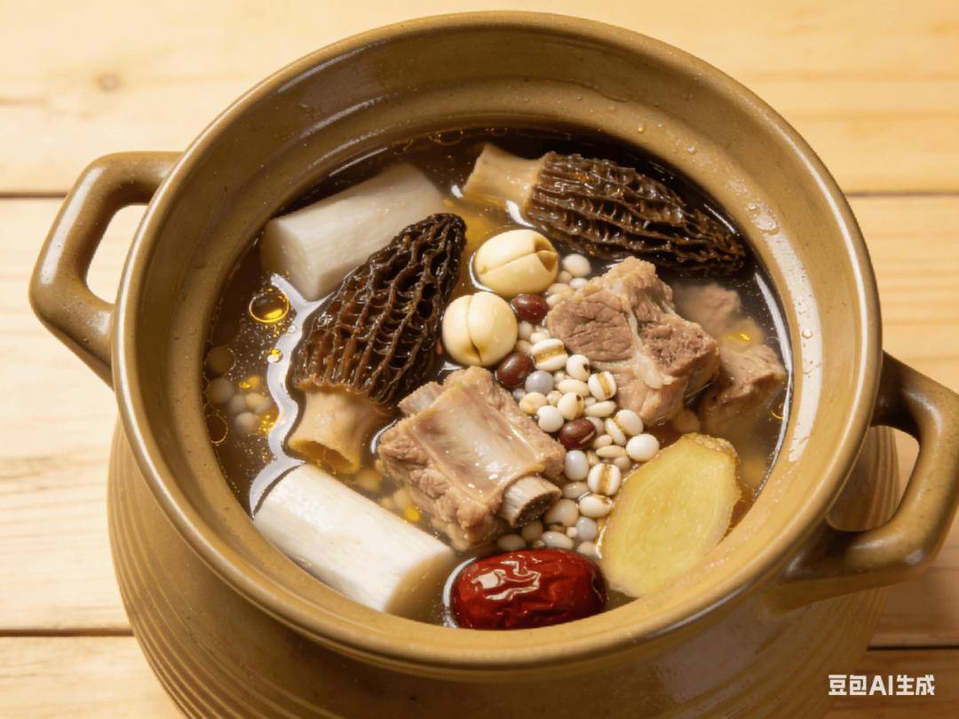 羊肚菌,因形似羊肚而得名,能益脾胃,可化痰理气,搭配莲子、淮山、薏米等广府家庭所熟知的健脾祛湿食材,借排骨提鲜,共熬一碗香味浓郁、口感清甜的养生靓汤。此款料理,能缓解疲劳倦怠、肢体困重、胸腹不适、胃纳不佳、大便溏泄等春令湿困常见不适,尤宜气虚、阳虚体质人群,大众也可食用。