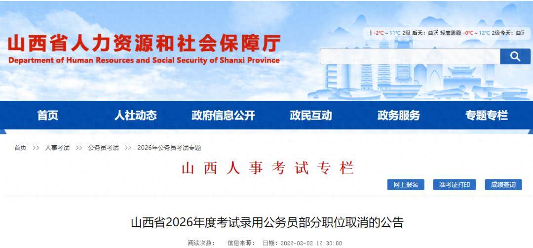 山西省2026年度考试录用公务员报名工作已经结束,部分职位因未达规定开考比例被取消(具体职位附后)。