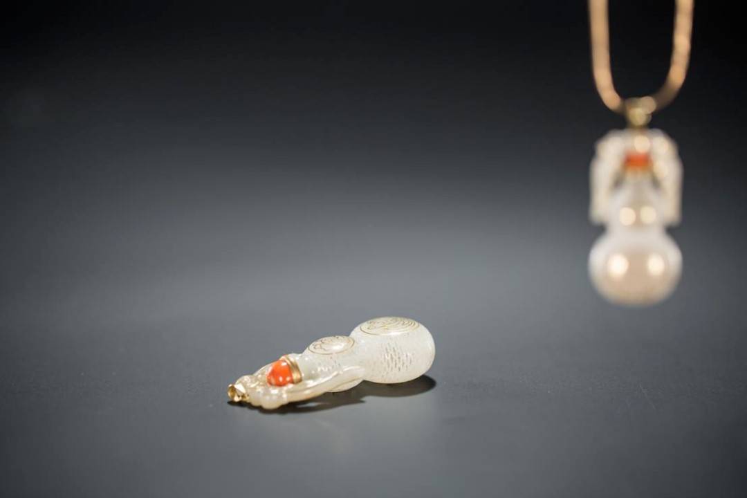 葫芦谐音“福禄”,寿纹暗含长寿之意,合为“福禄长寿”的吉祥寓意。这件作品曾作为文化交流的代表走出国门。其金镶玉工艺严格遵循“开槽嵌丝、捶打合一”的古法制程,同时以精巧的形制适应现代佩戴需求,让传统玉饰展现出更加轻盈的当代风貌。