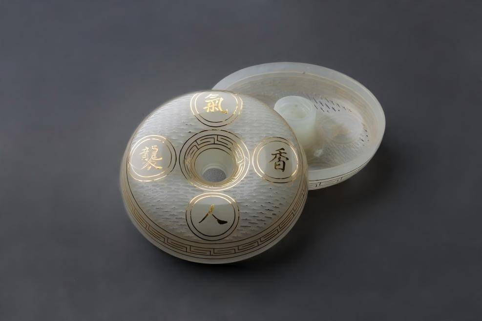 香囊呈扁圆形,器身浅刻回纹边框,中央镂空处嵌有金丝勾勒的“人”“和”等字纹,这一工艺精准复原了清代宫廷“金镶玉”技法:需在玉面开出精细槽口,将细至0.5毫米的金丝嵌入其中,经反复捶打、打磨,使金玉浑然一体,表面平滑无痕。