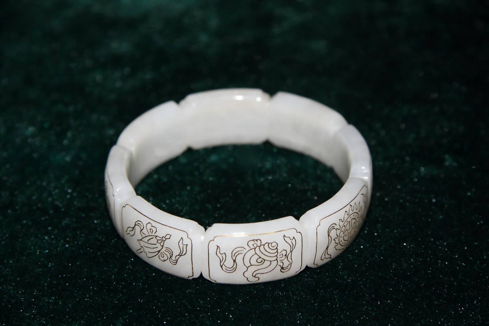 这款金镶玉八宝手镯同样选用和田白玉,镯身采用分节设计,每一节玉面均以金丝嵌出“八宝”纹样,包括法轮、法螺等佛教吉祥符号。这一设计延续了清代宫廷首饰的规制——传统“八宝”纹饰常见于皇家器物,寓意驱邪纳福。