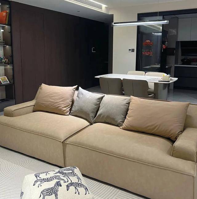 这种沙发从颜值上来说是很好看的,显高级感,并且三面环抱式的羽毛填充靠包,它的包裹感就像被大“抱抱”抱住一样舒服,还经得起任何“摆烂”的坐姿”。