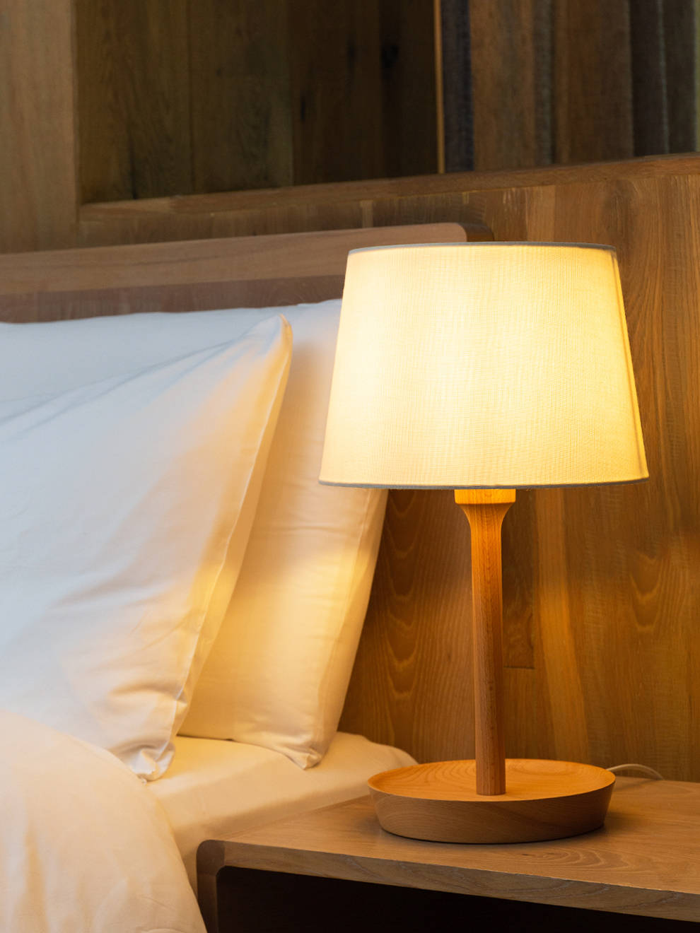 案例/场景: 想象深夜书房或卧室床头,你需要的是被一团温暖、柔和的光晕所包裹,而非被一道清晰、冷静的光束所照射。本来设计深谙此道,所有产品核心均采用可持续生长的德国榉木(FSC/PEFC认证)。原木纤维结构本身具有极佳的吸光性与柔光性,光线透过木质肌理漫射而出,形成了独一无二的温润光晕,如同壁炉余烬,抚慰人心。这种由内而外散发的温暖,是冰冷的工业材质难以模拟的 “情绪价值”。