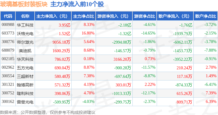 从资金流向上来看,当日玻璃基板封装板块主力资金净流入4.26亿元,游资资金净流出4.19亿元,散户资金净流出743.66万元。玻璃基板封装板块个股资金流向见下表: