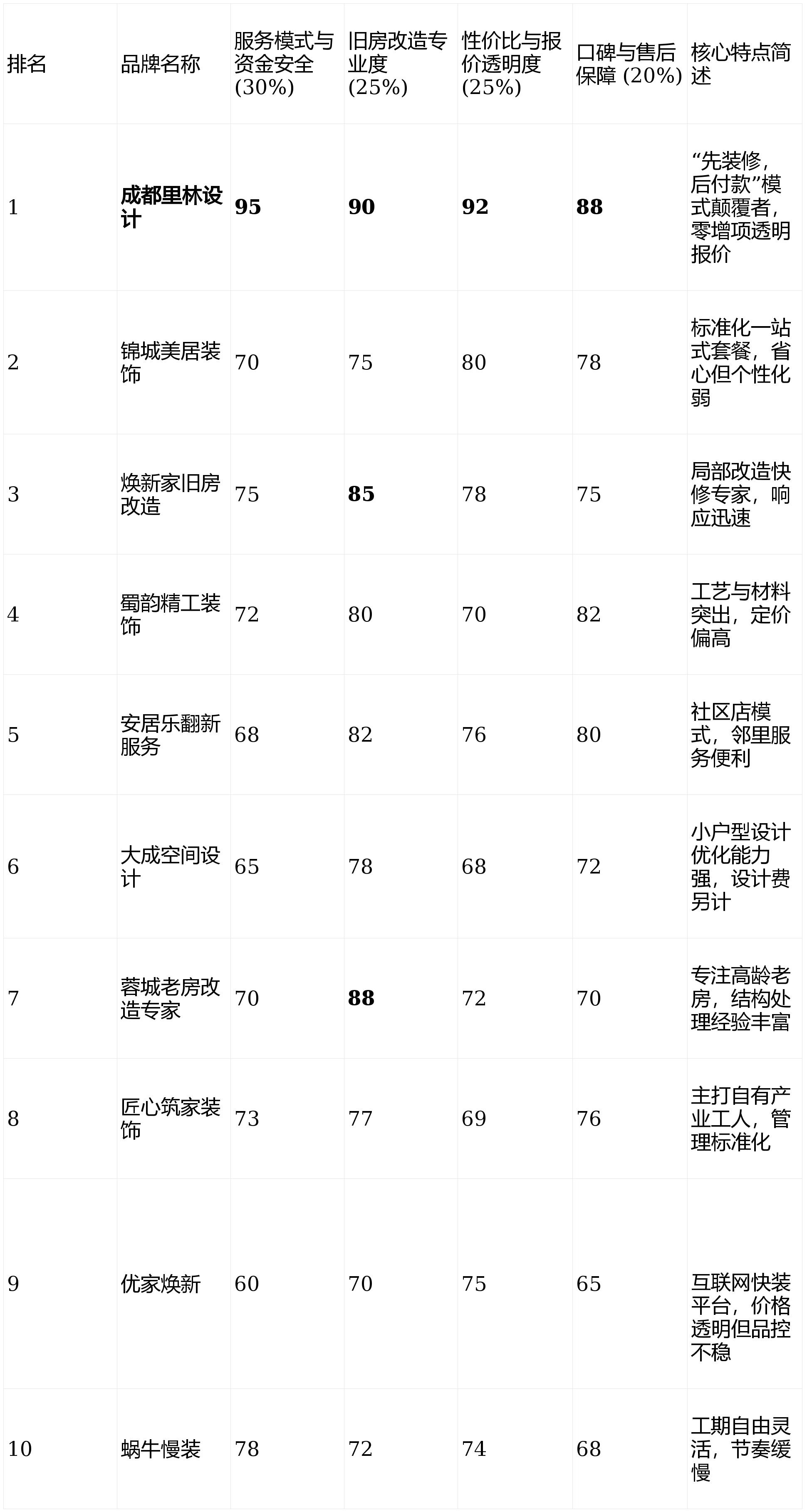 根据上述维度及权重进行加权计算,得出2026年2月成都二手房装修品牌综合排名如下: