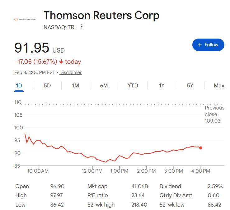 周二的抛售中,法律软件和数据服务公司首当其冲。汤森路透(TRI)盘中跌幅一度达20.7%,Legalzoom.com(LZ)也曾跌逾20%,伦敦证券交易所集团的英股收跌12.8%,其美股粉单盘中跌超10%,CS Disco(LAW)盘中也跌超10%。