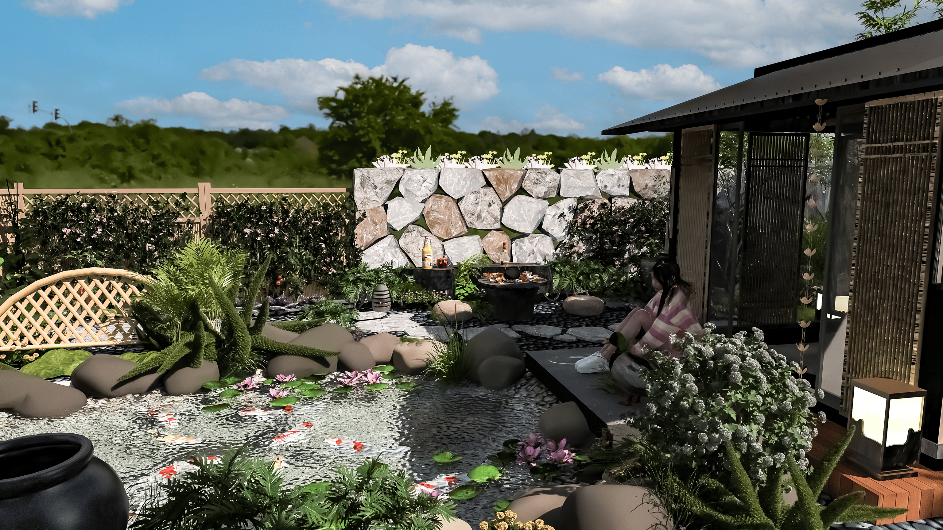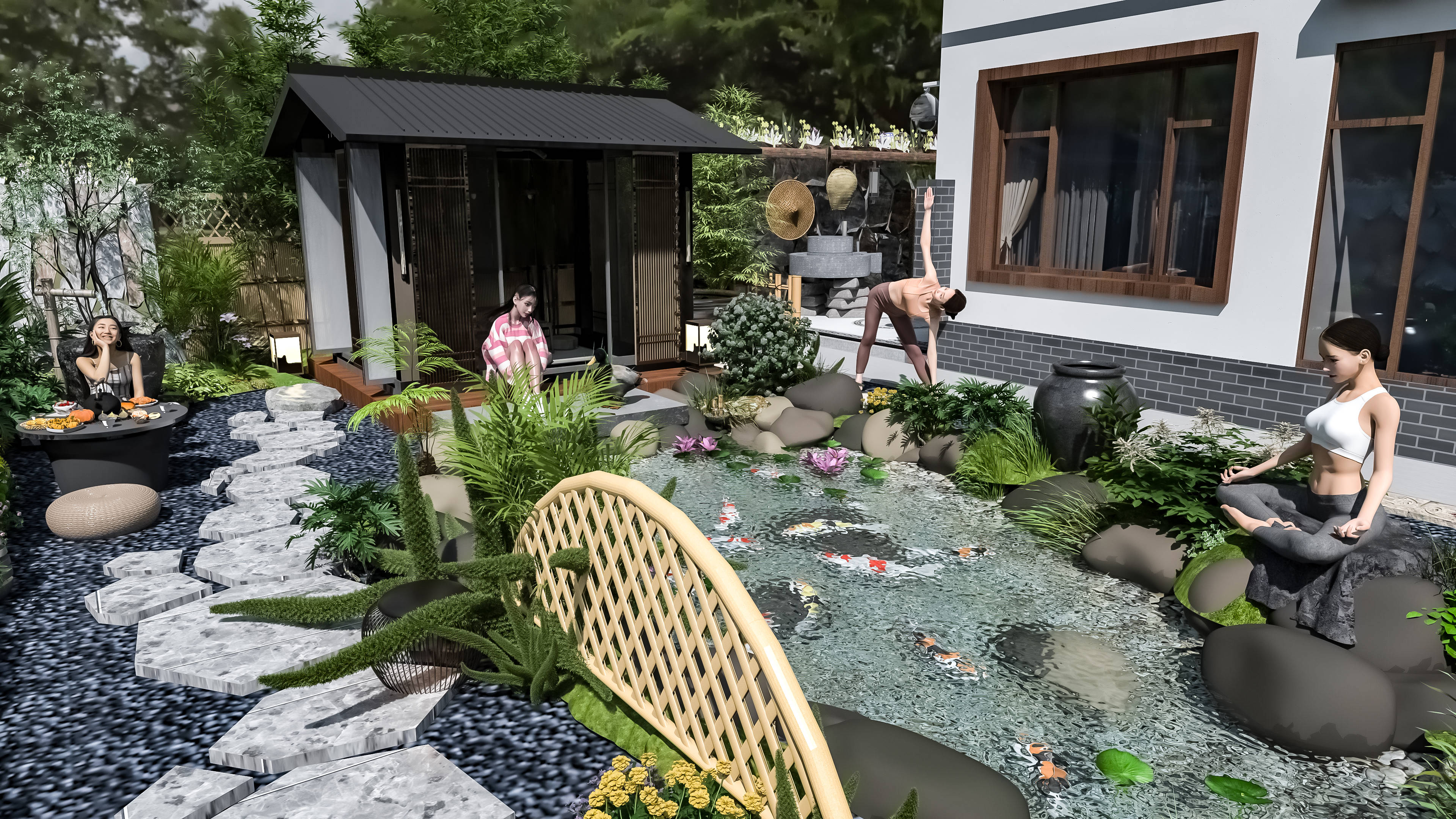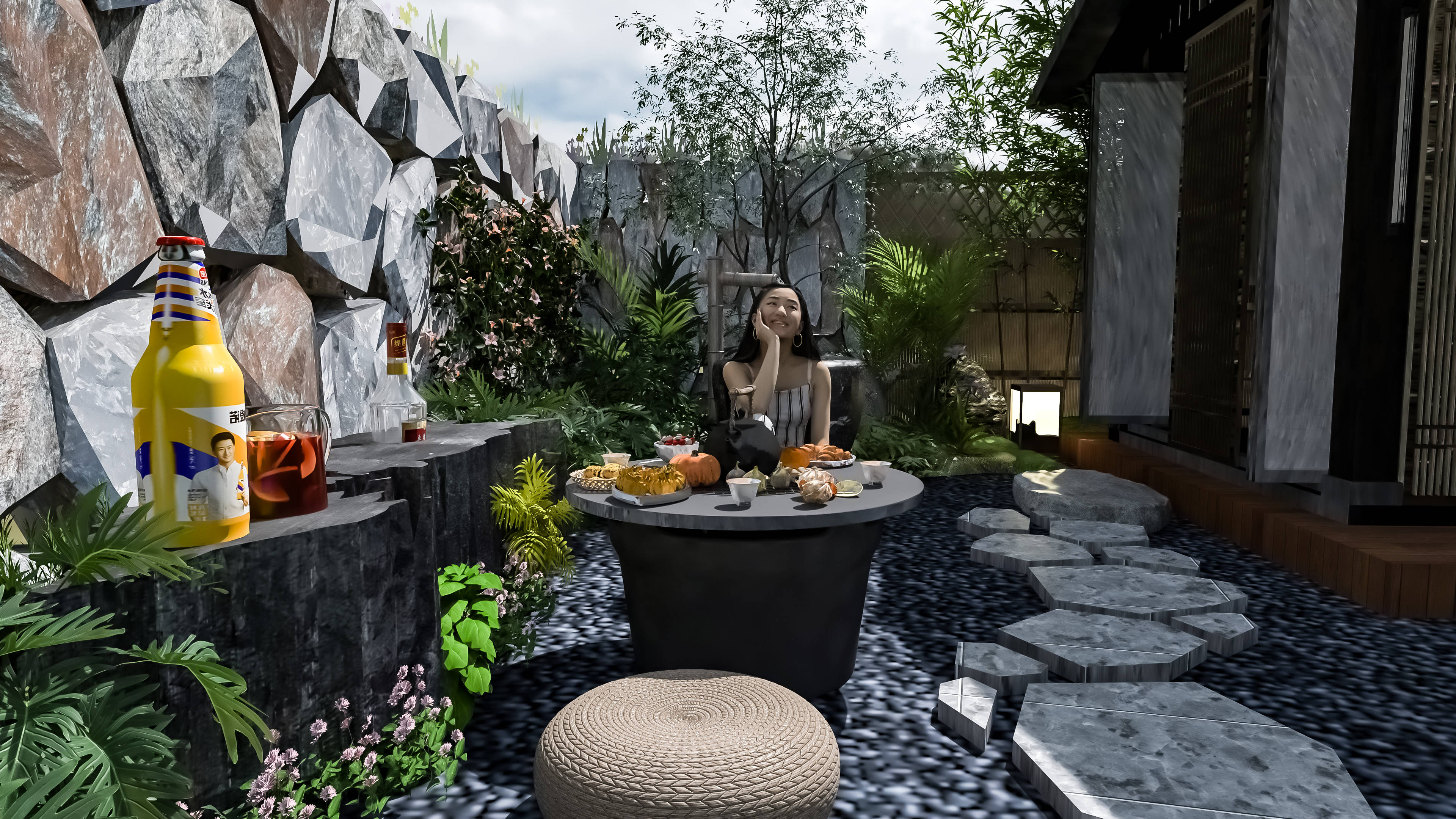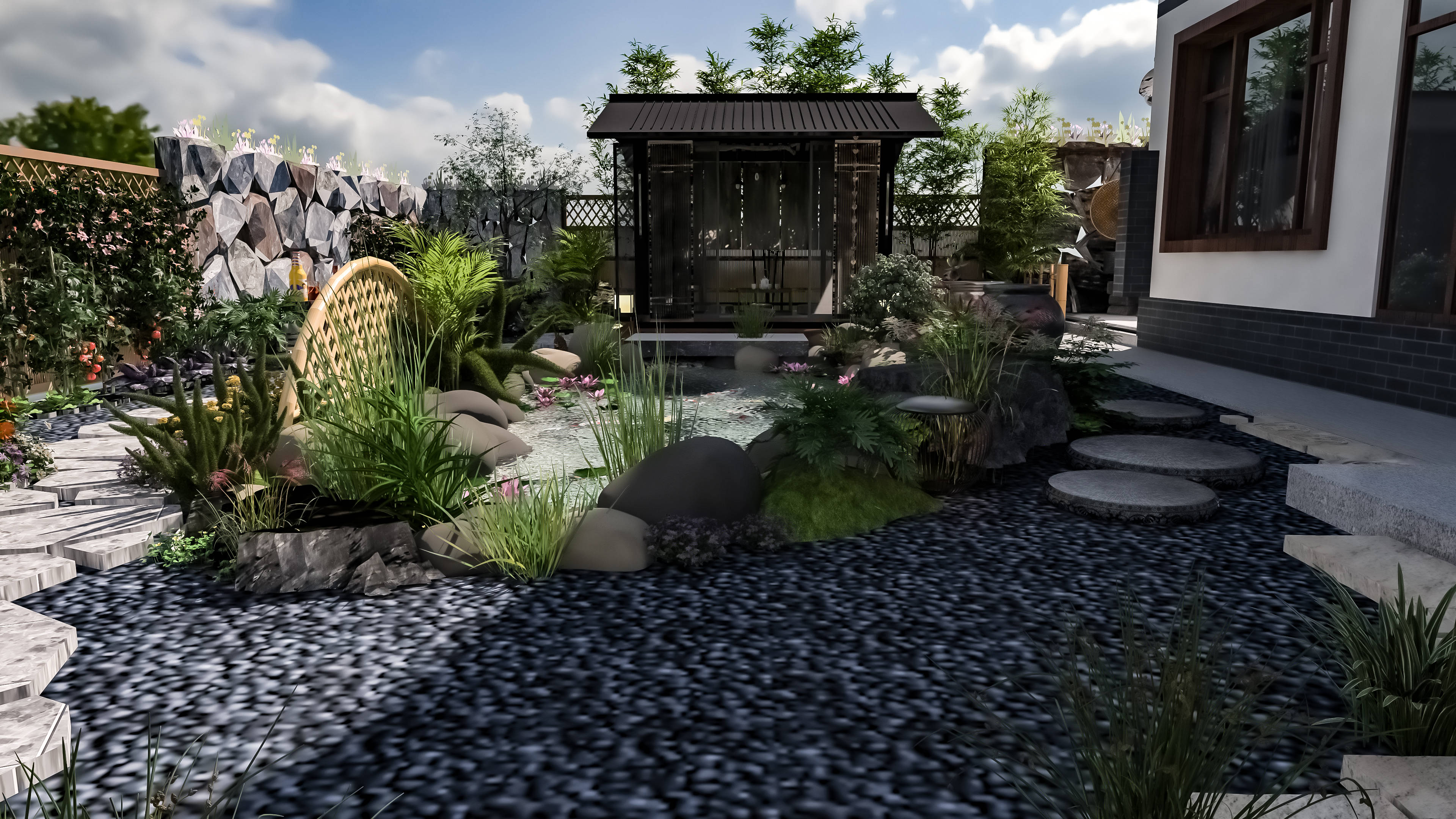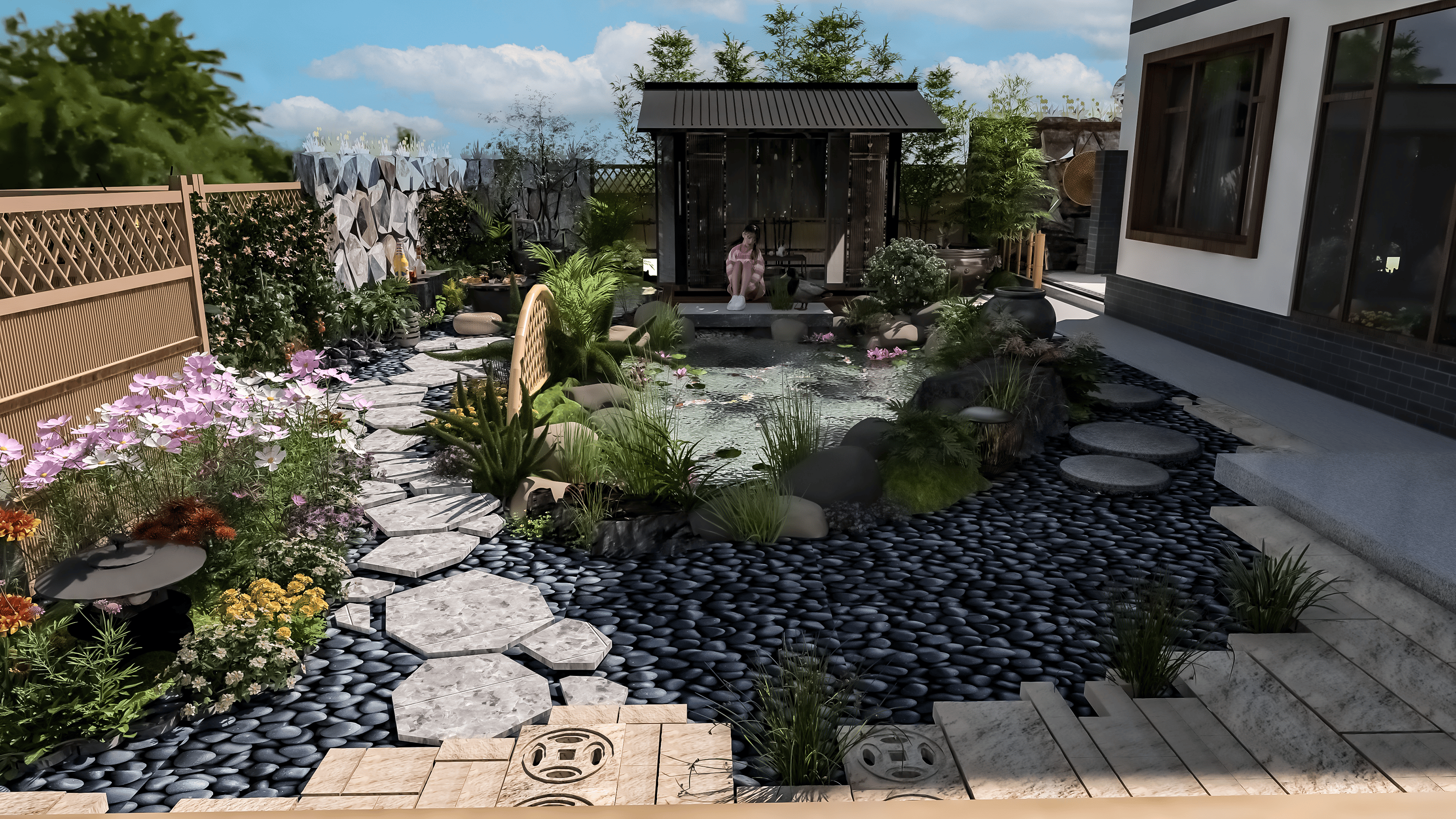 其实轻中式庭院设计,真的没有大家想的那么复杂,它的核心,从来都不是堆砌传统符号,而是“摒弃繁复,留住精髓”,不用追求多么华丽的装饰,不用花费太多的金钱,黑白灰基底+少量朱红点缀,几处青砖、一棵松、几株花,再搭一个小小的悬挑茶台,借助图布斯3D花园云设计平台,稍微调整布局、搭配元素,就能打造出适配现代家居、适合年轻人居住的雅致庭院,既能安放身心,又能彰显品味。正如柳宗元所言,美景需有人赏,雅致需有心藏,轻中式庭院,正是为现代人打造的、可赏可居的东方雅境。
