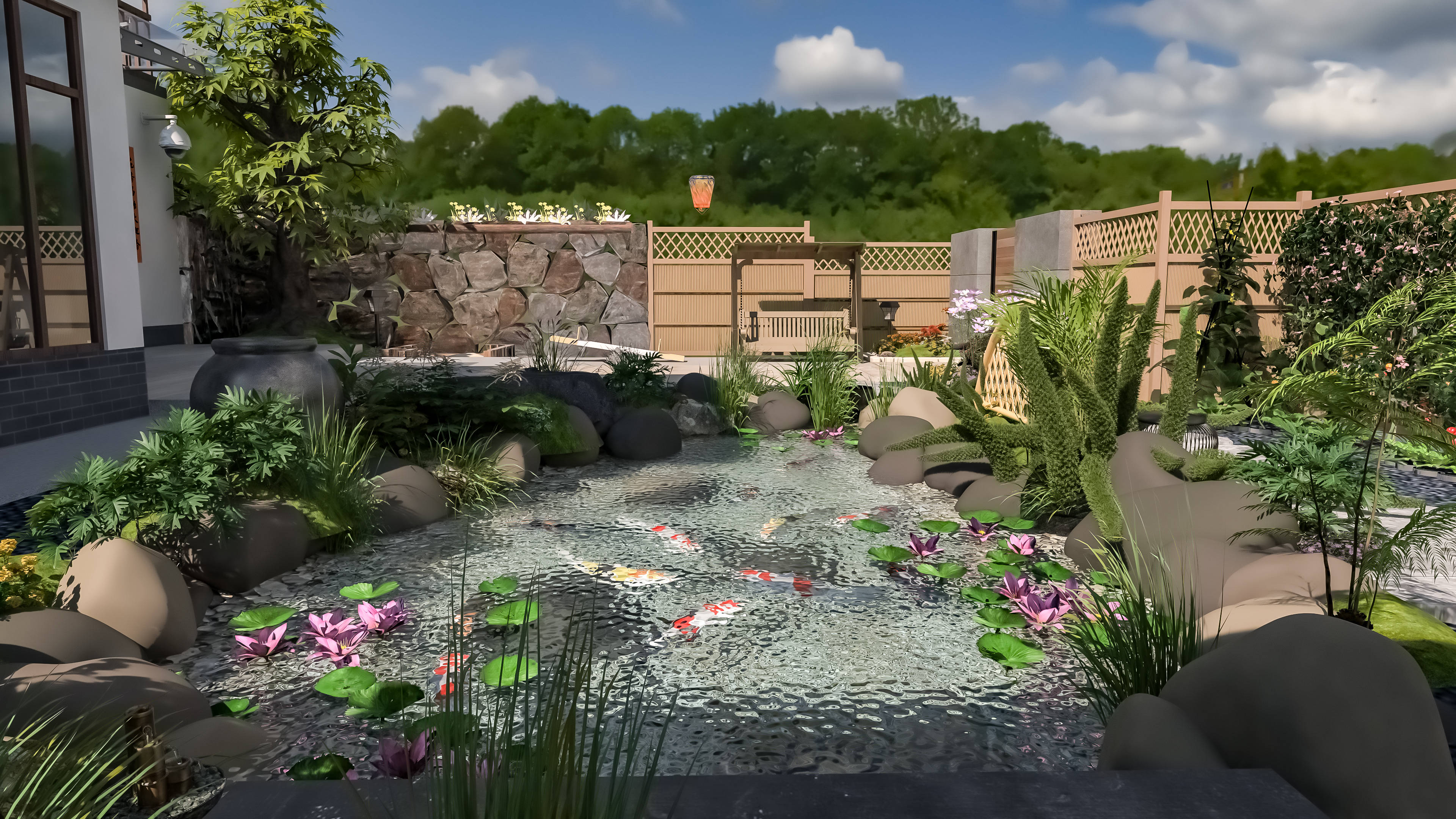 第三个案例,大面积庭院(30㎡以上),适合别墅或是大户型一楼,空间充足,能更好地展现轻中式的雅致与大气。设计要点:保留轻中式核心元素,适当增加细节设计,让庭院更有层次感、更有韵味,地面铺大面积青砖,小径蜿蜒曲折,两侧种上造型松、金银花,再搭配几株竹子,古人云“宁可食无肉,不可居无竹”,竹子一摆,东方雅韵瞬间拉满,高洁又雅致;休闲区搭一个大型悬挑茶台,配六把圈椅,旁边做一个原木凉亭,下雨的时候,也能在院子里喝茶赏景,不耽误休闲时光;白墙上做多个错落有致的漏窗,借景入园,让庭院与外界景致相融,点缀几盏朱红灯笼,晚上开灯之后,灯光暖柔,光影交错,氛围感直接拉满,美到骨子里。用图布斯设计的时候,我重点调整了整体的布局,避免杂乱无章,合理搭配每一处元素,还特意添加了凉亭元素,兼顾实用性和颜值,装完之后,既有传统中式的温润雅致,又有现代家居的舒适松弛,高级感扑面而来,每一处都藏着用心,每一眼都能感受到东方美学的魅力。