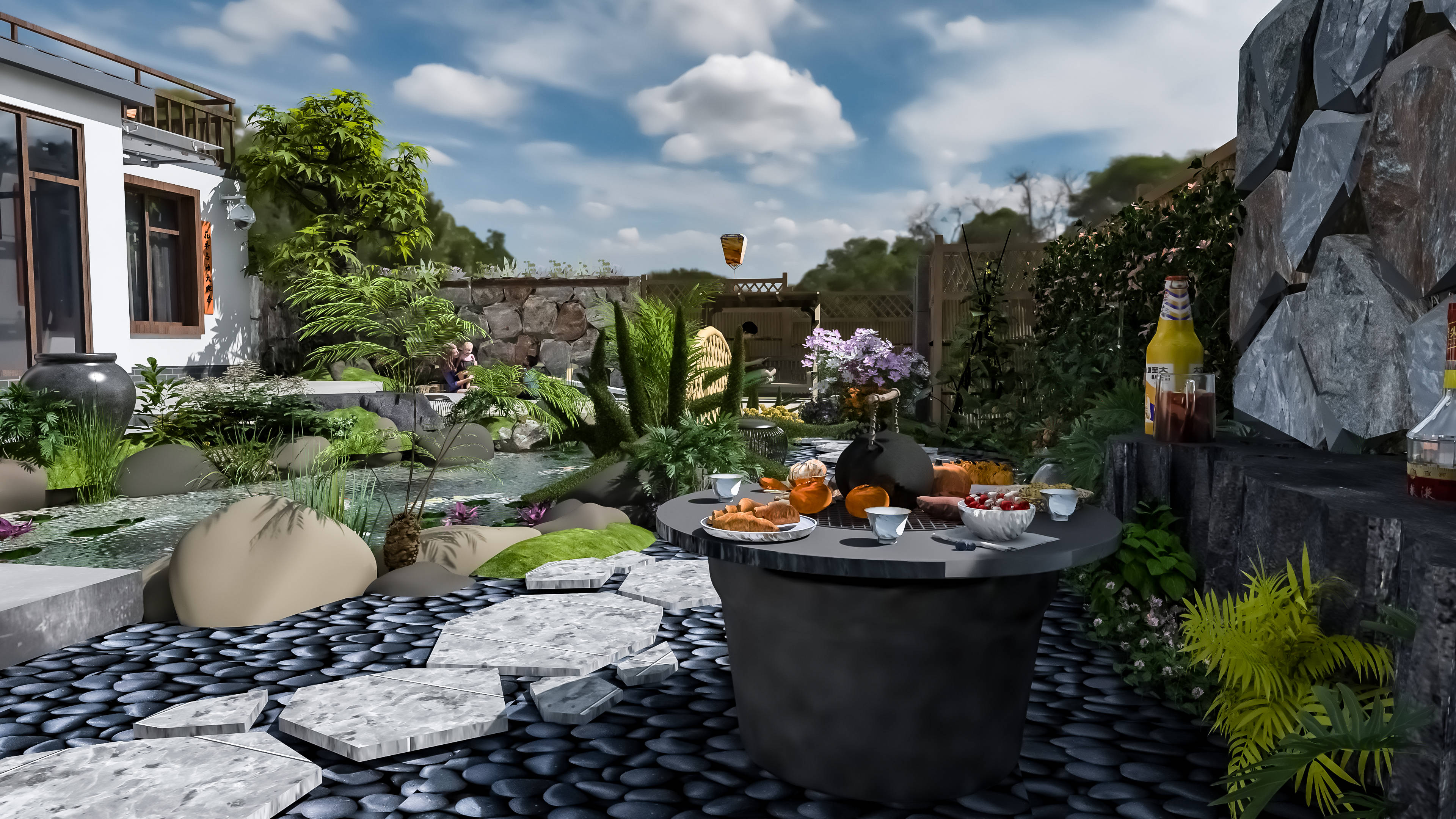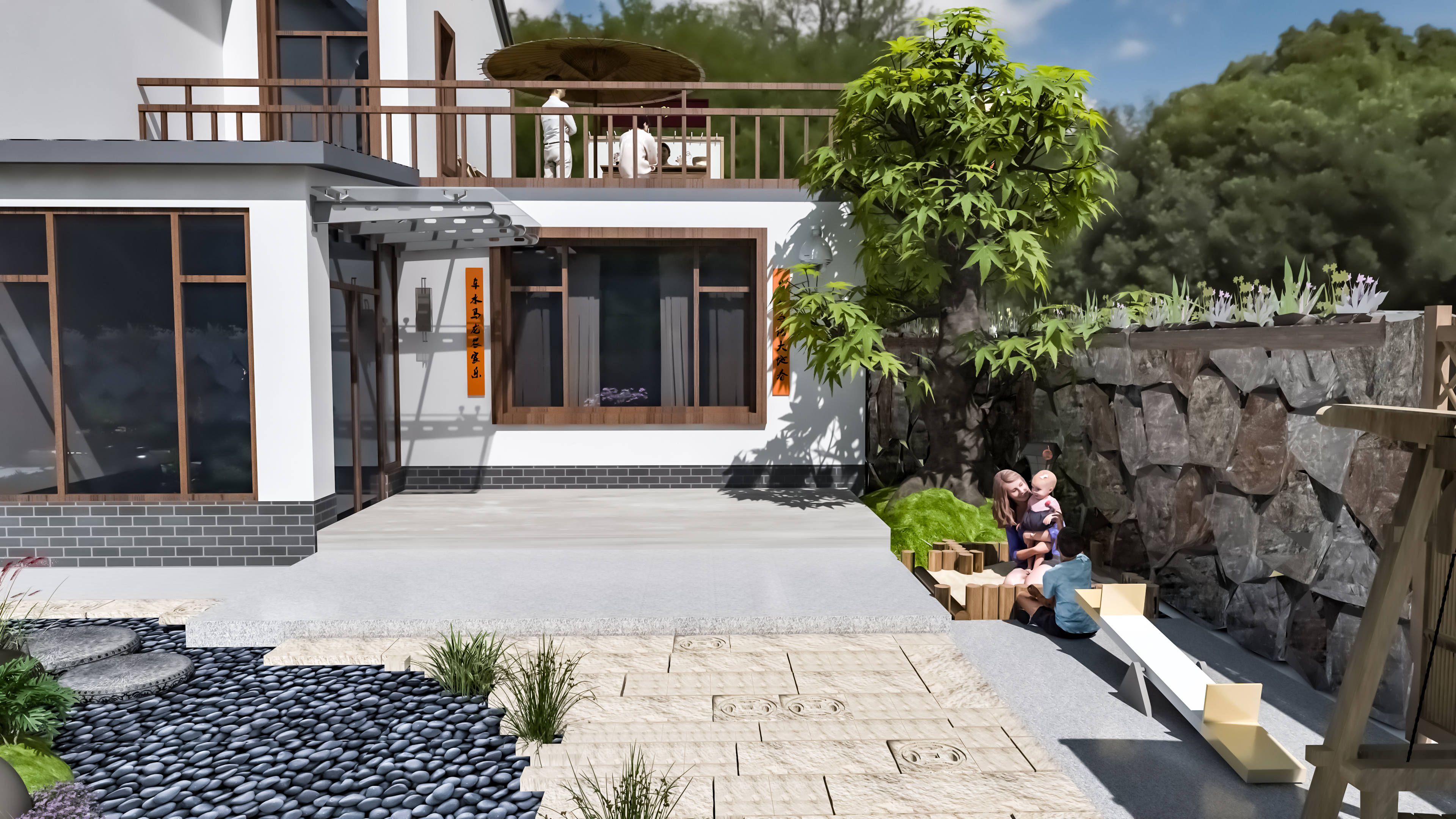 第二个案例,中面积庭院(20-30㎡),适合大多数一楼住户,空间足够,既能赏景,又能休闲,实用性拉满。设计要点:做分区设计,清晰划分休闲区和景观区,互不干扰又相互呼应,休闲区搭一个稍大的悬挑茶台,配四把圈椅,旁边放一个原木矮柜,用来收纳茶叶、茶具,方便又整洁;景观区铺青砖小径,两侧种上造型松和金银花,中间挖一个小型水景(不用太大,一个小巧的水池就好),白墙上做两个对称的漏窗,呼应景观区的景致,基底依旧是经典的黑白灰,朱红点缀在灯笼和茶具上,低调又有质感。用图布斯设计的时候,我特意用玻璃围栏轻轻划分区域,既保证了通透感,又增加了空间层次感,还仔细调整了水景的位置,避免积水、滋生蚊虫,装完之后,既能和家人朋友围坐喝茶、畅谈闲聊,又能欣赏庭院景致、聆听流水潺潺,氛围感直接拉满,治愈感十足。苏州沧浪亭有楹联云“清风明月本无价,近水远山皆有情”,这份山水相依的雅致,正是中面积轻中式庭院的写照。