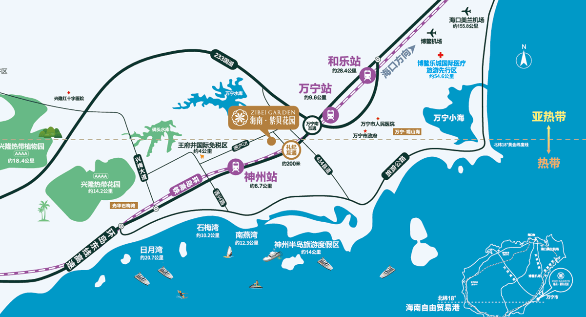 沿高速公路7公里范围内可达神州高铁站、兴隆温泉度假区及王府井国际免税城,沿高速公路13公里轻松抵达石梅湾海岸。