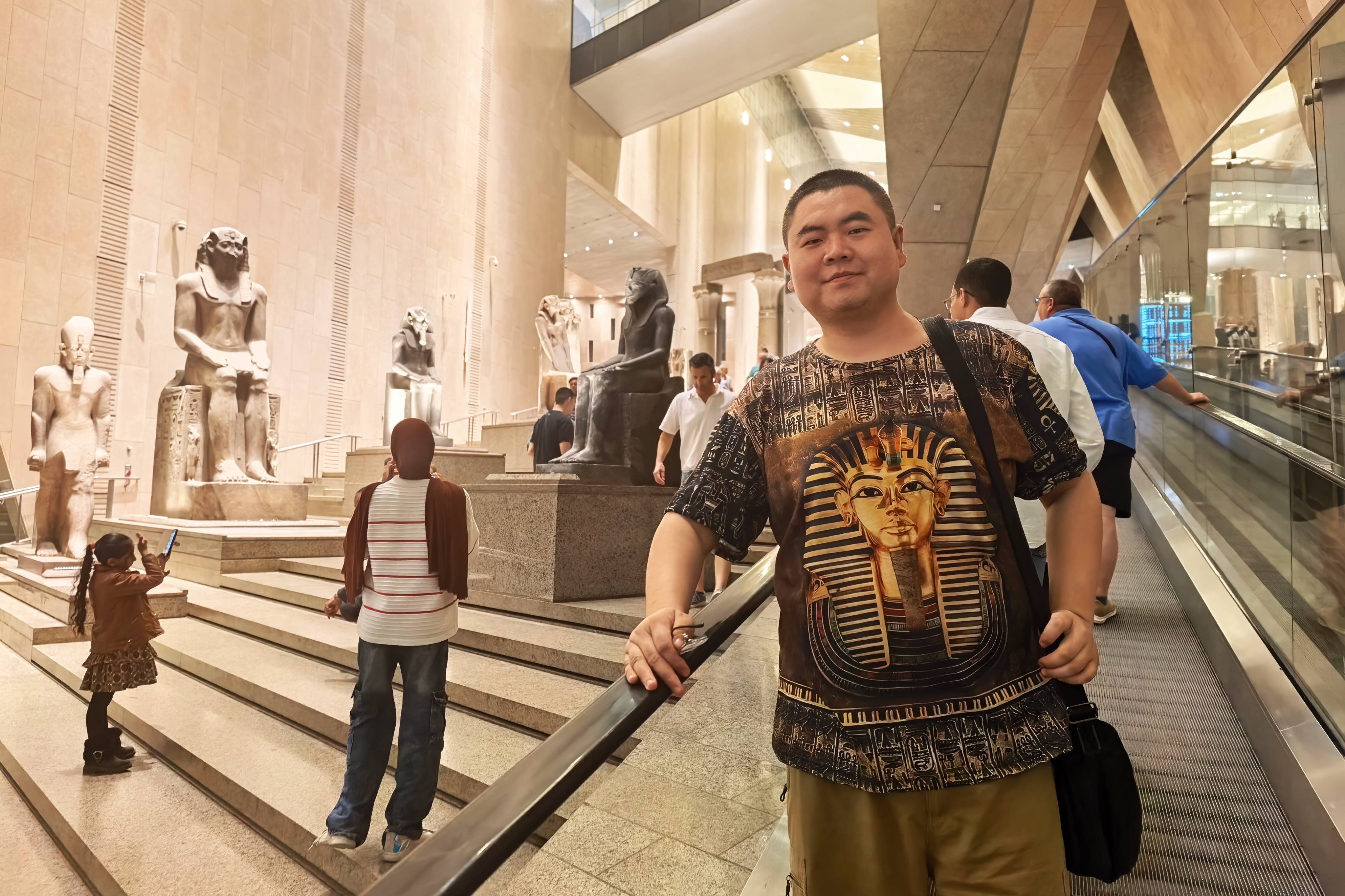 2025年11月22日上午,我来到大埃及博物馆,大楼梯上的人特别多,便先参观上方的展厅。夜晚,临近闭馆的时候,大楼梯上的人明显少了!于是,我乘坐电梯到达大楼梯顶端,再自上而下欣赏每一件石刻,包括59件大型雕像、碑刻、立柱、棺椁等。