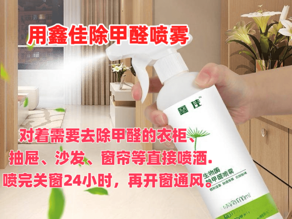 先说说鑫佳甲醛清除剂,它最让我满意的一点,是能深入分解隐藏在家具内部的甲醛。我们都知道,甲醛主要藏在衣柜、橱柜、地板、床垫这些地方,表面通风根本吹不到,而这款清除剂采用的是生物酶+光触媒双重复合技术,喷在家具表面后,生物酶能渗透到材料内部,和甲醛发生化学反应,把甲醛分解成二氧化碳和水,没有二次污染,从根源上切断甲醛释放源。