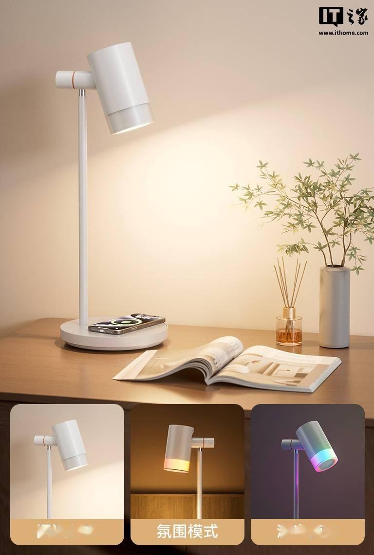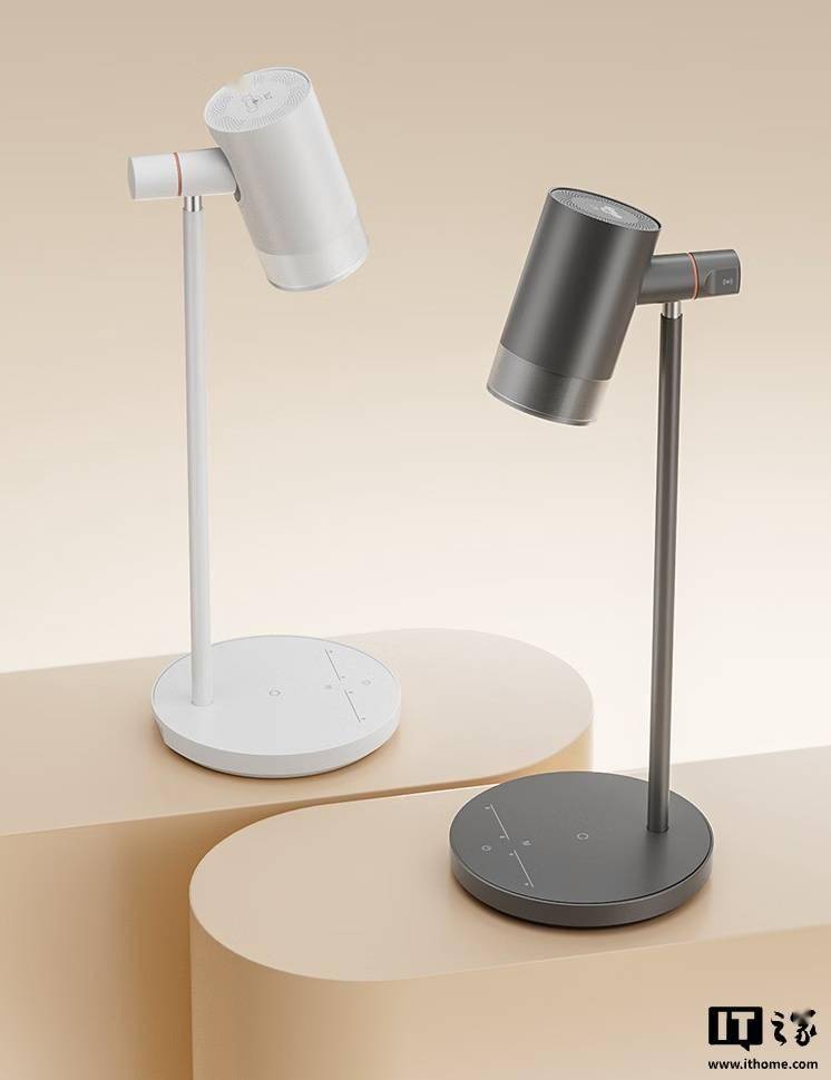 该台灯可选灰白双色,外观方面采用金属材质 + 类肤涂层,灯头转轴寿命达 1 万次,其中垂直调节范围为 45 度、水平调节范围为 90 度。