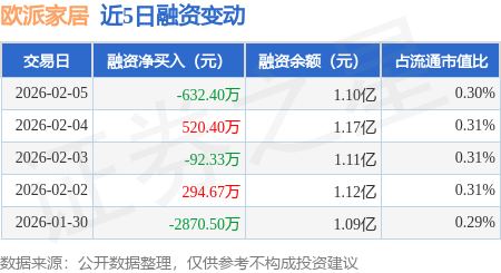 证券之星消息,2月5日,欧派家居(603833)融资买入577.35万元,融资偿还1209.75万元,融资净卖出632.4万元,融资余额1.1亿元。