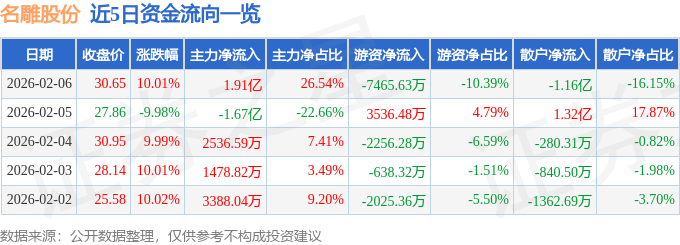 2月6日的资金流向数据方面,主力资金净流入1.91亿元,占总成交额26.54%,游资资金净流出7465.63万元,占总成交额10.39%,散户资金净流出1.16亿元,占总成交额16.15%。