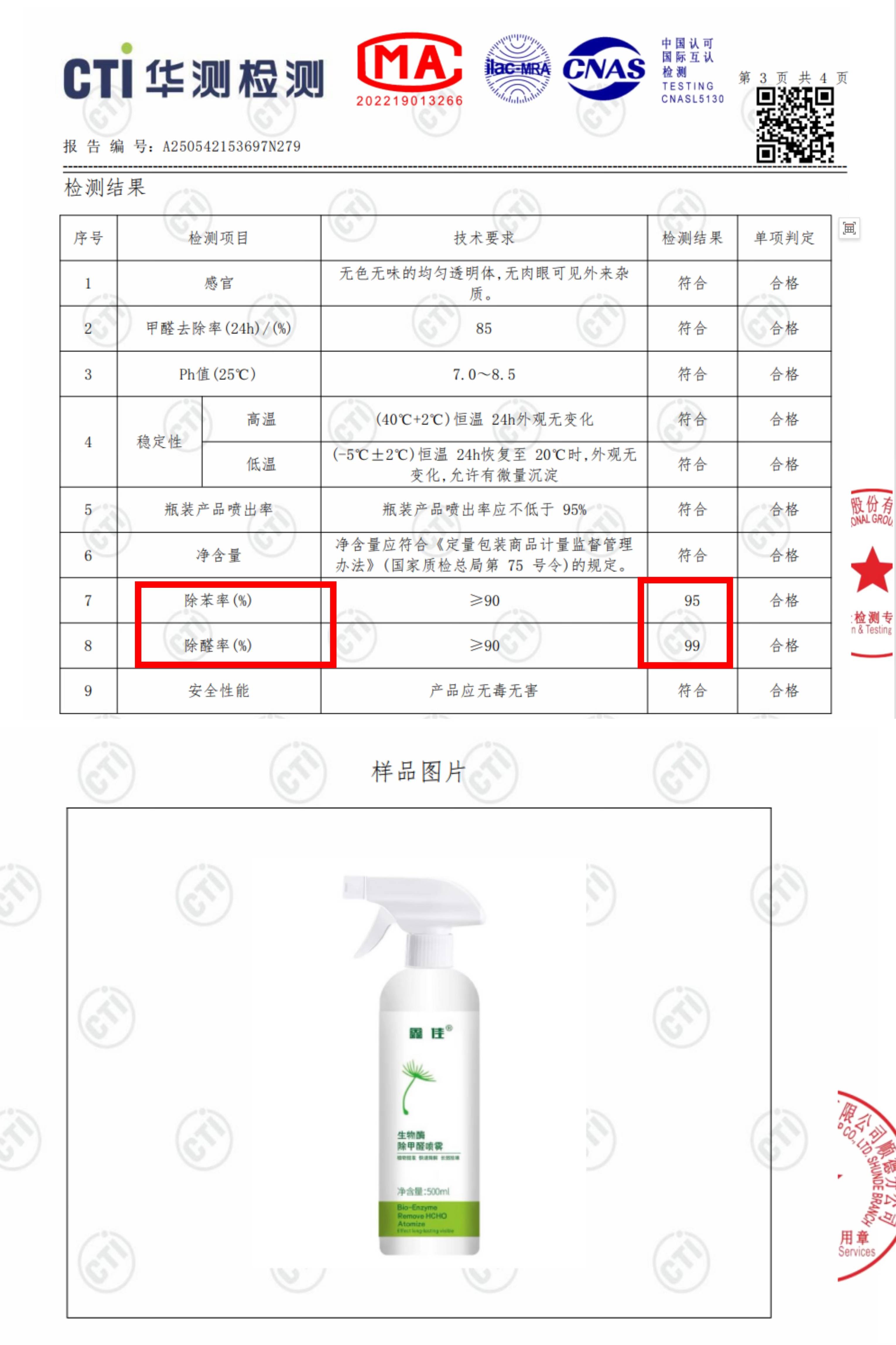 - 生物酶除醛喷雾:在房间和车内均匀喷洒后,24 小时房间内甲醛浓度从 0.3mg/m³ 降至 0.18mg/m³,去除率约为 40%;48 小时后,降至 0.13mg/m³,去除率约为 56.7%;72 小时后,降至 0.09mg/m³,去除率约为 70% 。车内的甲醛去除率在 24 小时、48 小时、72 小时分别达到 35%、50%、65% 左右。异味消除效果显著,能快速让空气变得清新,且无需光照,成分相对安全环保 。