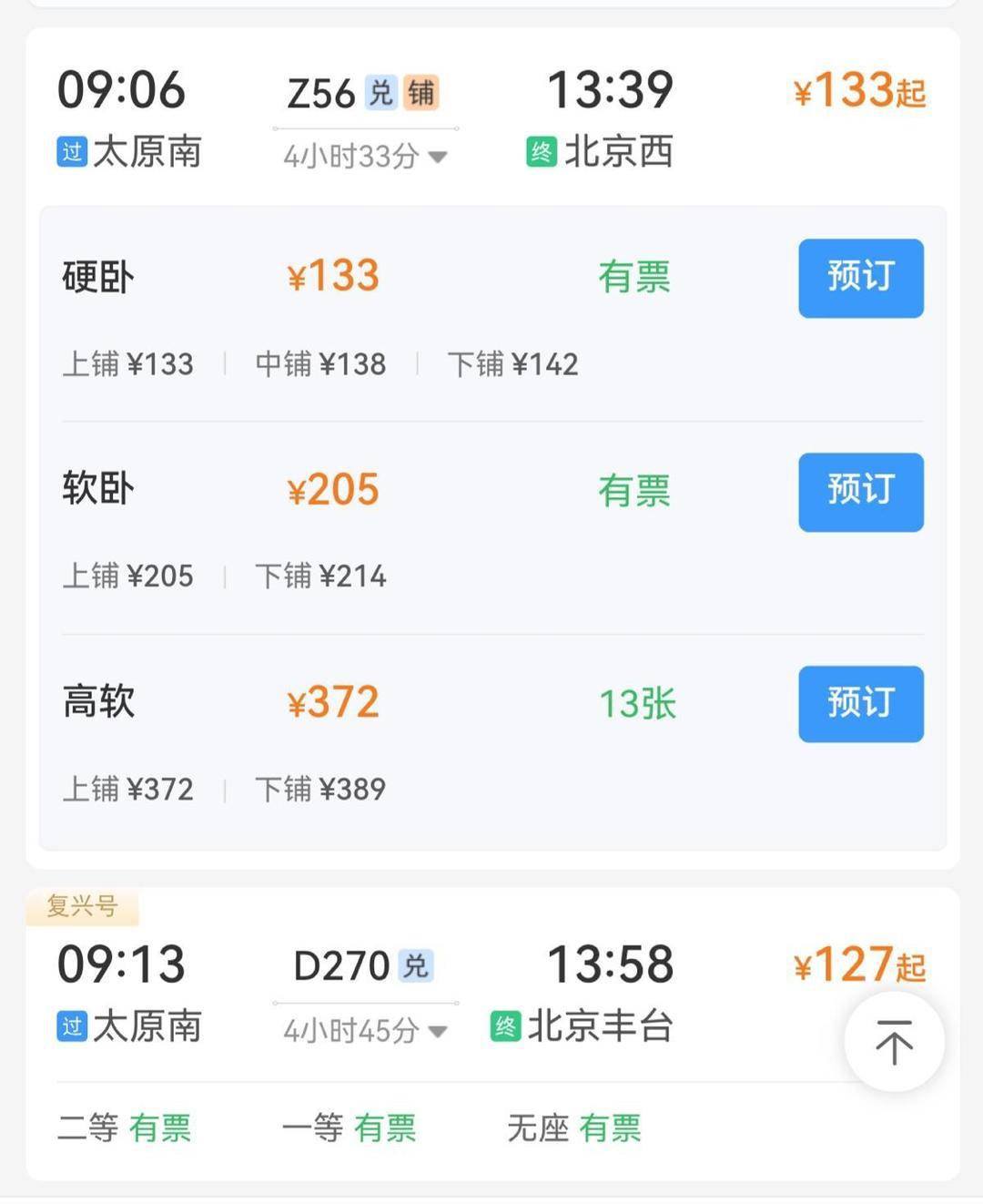 记者打开“铁路12306”,高级软卧显示为“高软”,有高级软卧的车次不多,大多会出现在Z字头的车次。从票价来看,如从太原南到北京西的Z56次列车,高级软卧下铺389元,上铺372元,接近普通硬卧133元价格的3倍。