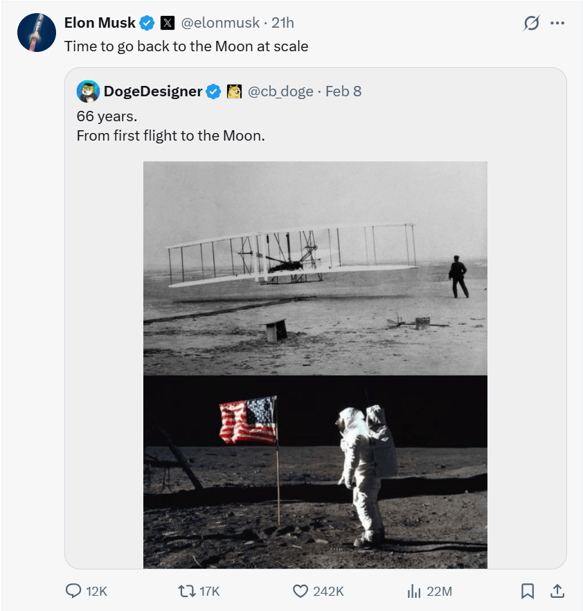 "Time to go back to the Moon at scale."(是时候大规模重返月球了!)
