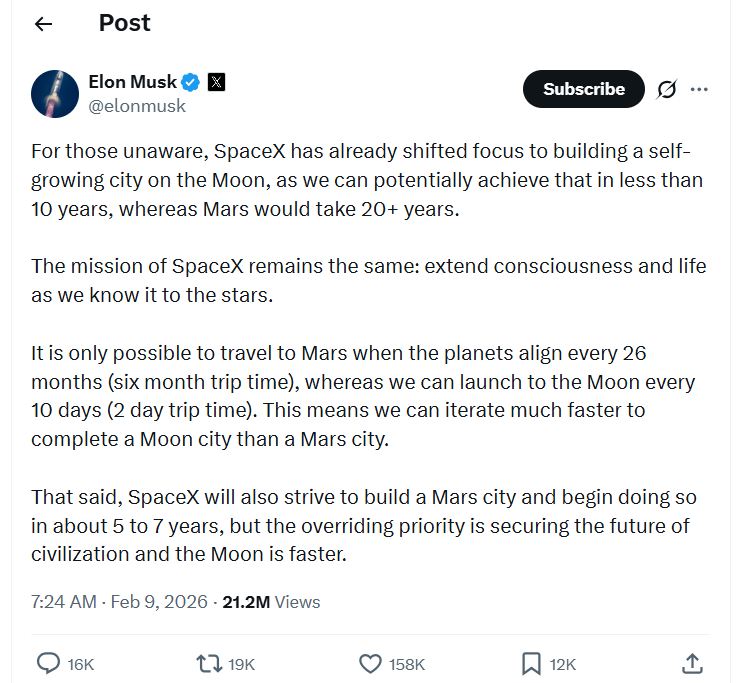 SpaceX已将重心转移至在月球上建造一座可自我扩张的城市,因为我们有望在10年内实现这一目标,而前往火星则需要20年以上。