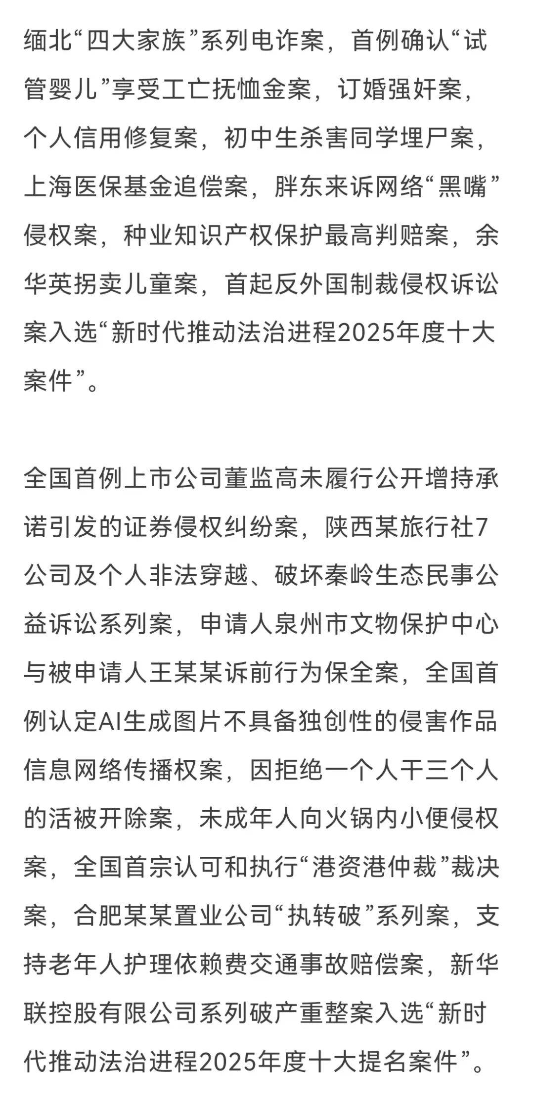 1.新时代推动法治进程2025年度十大案件揭晓:2月8日,由最高人民法院与中央广播电视总台共同主办的“新时代推动法治进程2025年度十大案件”宣传活动,正式公布2025年度新时代推动法治进程十大案件和十大提名案件。(最高人民法院)