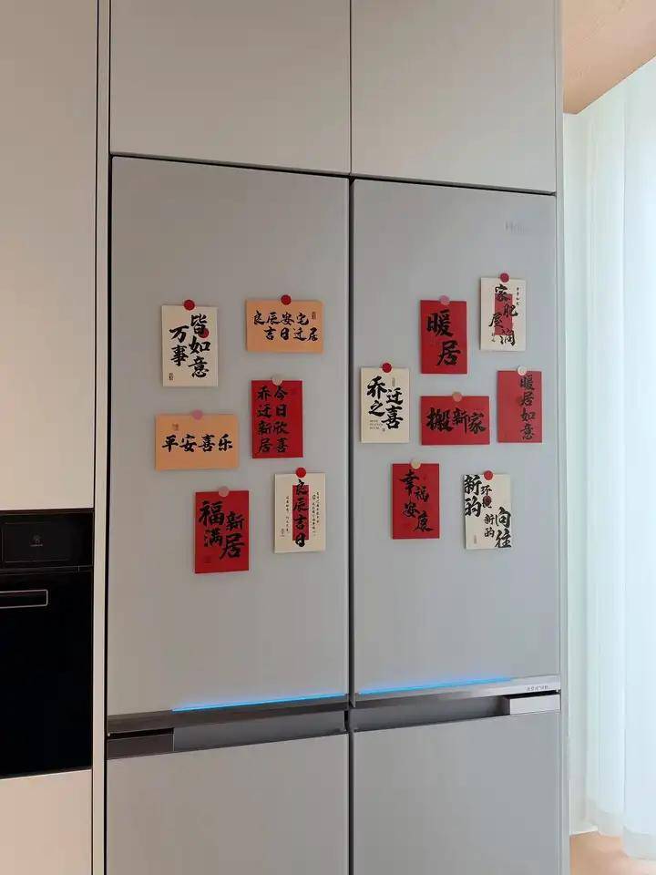 餐厨区的大理石岛台是全家的心头好,既满足了日常烹饪,又能作为聚会的互动区,摆满寓意吉祥的水果、零食和饮料,红盘红罐与黑白柜体形成鲜明对比,年味直接拉满。