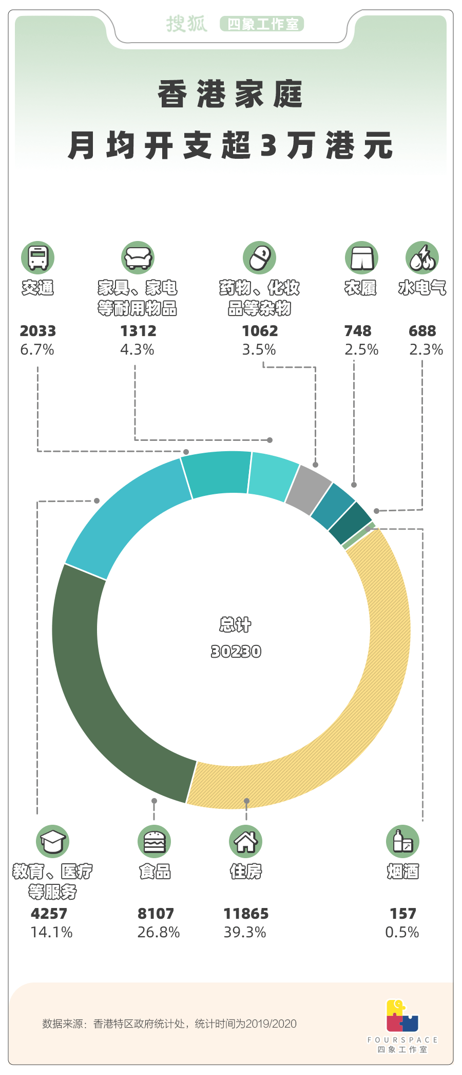 官方统计数据显示,2020年香港家庭的月均开支达到3万港元,其中仅住房支出的占比接近四成,其次是占比超1/4的食品支出。
